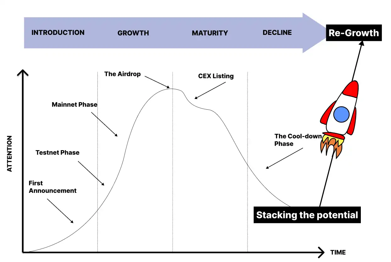The vast majority of first and second generation Web3 projects have already gone through a cycle, but most of them have given up in the decline phase without stacking their new potential. Some quietly exited the market in a soft rug pull, while others attempted to restart by launching entirely new projects, only to eventually fall out of the cycle without achieving further growth.