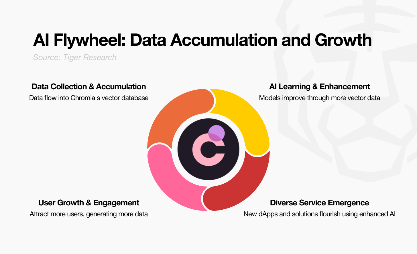 This accumulated data becomes high-value learning material for AI. For example, AI agents trained on patterns in user transactions could provide personalized financial guidance. These advanced, responsive AI applications enhance user experienceâbringing in more users, generating more data, and reinforcing the cycle. As the system scales, Chromiaâs vector infrastructure becomes the engine behind a self-reinforcing ecosystem where data, users, and AI performance grow together.