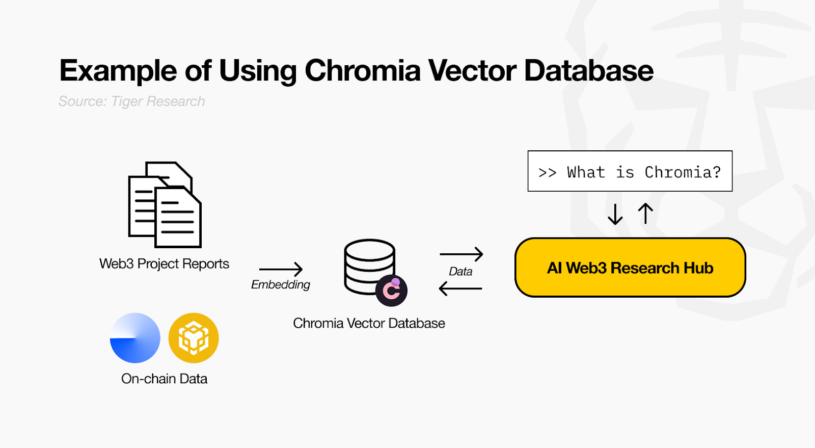 One hypothetical example can be the âAI Web3 Research Hubâ developed by Tiger Labs. This system leverages Chromiaâs infrastructure to convert research content and on-chain data from Web3 projects into vector embeddings, which are then used by AI agents to deliver intelligent services.