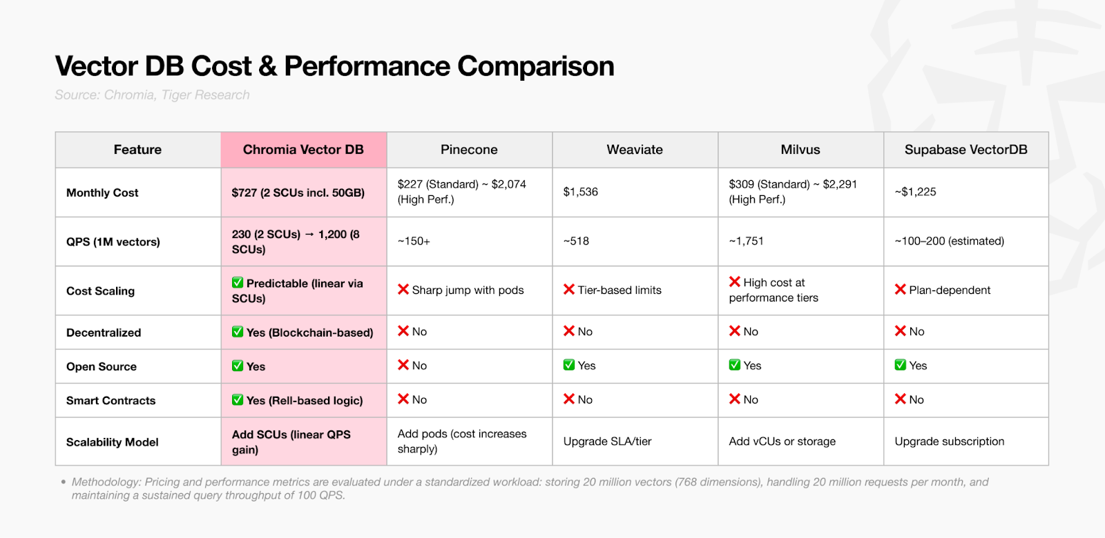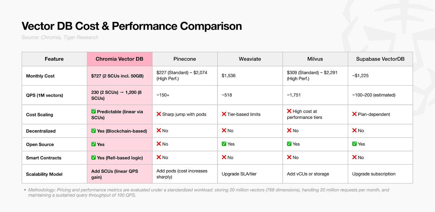 Chromiaâs vector database further strengthens this cost advantage. According to internal benchmarks, the database can operate at a monthly cost of $727 (based on 2 SCUs and 50GB storage)âa figure that is 57% lower than comparable Web2 vector database solutions.