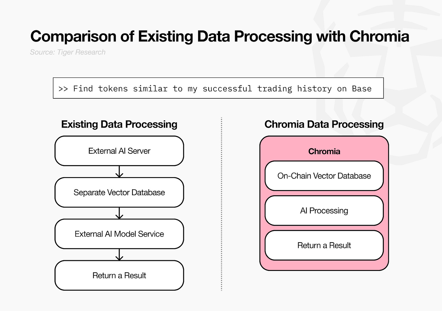 하나의 가상 예시로 호랑이연구소(Tiger Labs)에서 개발한 'AI 웹3 리서치 허브'를 들 수 있다. 이 시스템은 웹3 프로젝트 리서치와 온체인 데이터를 크로미아의 벡터 임베딩으로 변환해 'AI agent'를 활용하는 방식으로 작동한다.