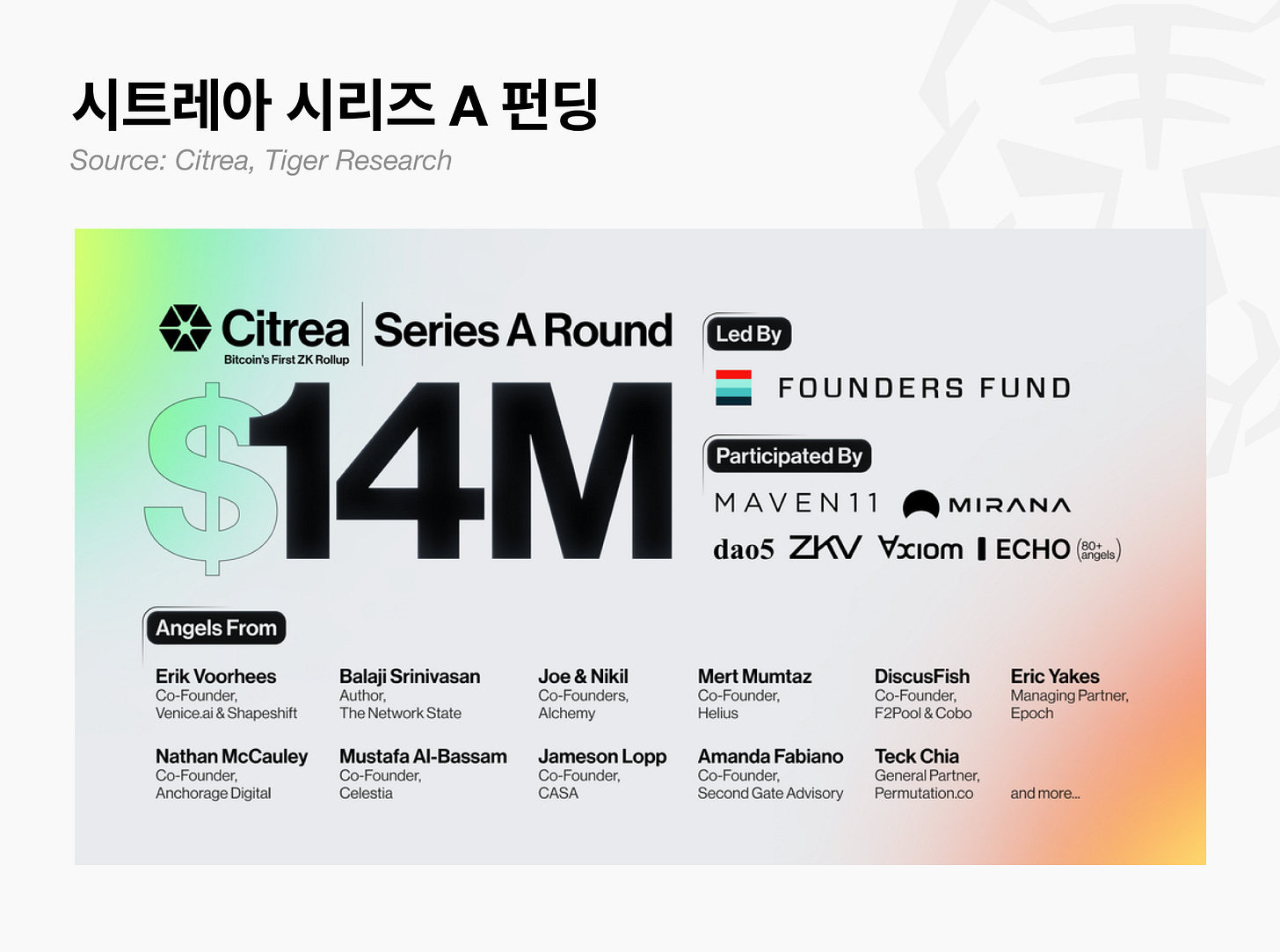 그 와중에 피터 틸의 파운더스 펀드(Founders Fund)가 시트레아(Citrea)에 투자를 단행했다. 단순 내러티브가 아닌 ZK 기술을 실제로 구현한 기술력을 보고 내린 결정이었다.