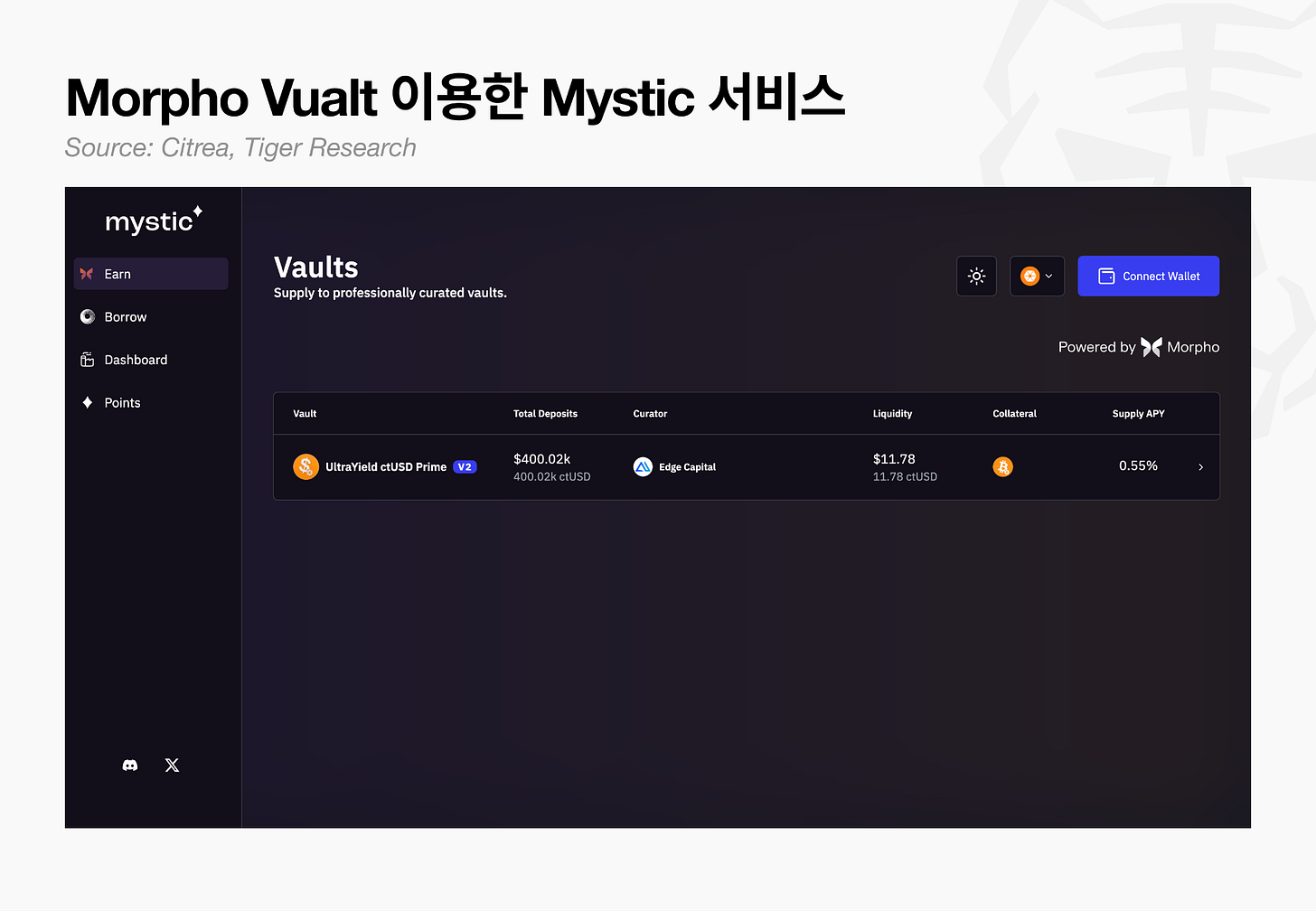 다만 시트레아는 아직 초기 단계다. TVL은 약 600만 달러 수준이고, 테스트넷 캠페인에 3만 3천 명이 참여했지만 그 기세가 메인넷으로 이어지지는 않았다. 출시한 지 채 3개월이 되지 않았고, 몰포 볼트 같은 핵심 서비스도 최근에야 가동을 시작했다.