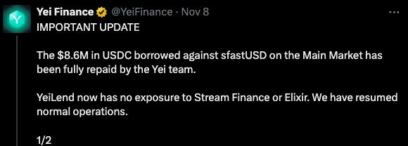 연쇄 붕괴는 여기서 그치지 않고 deUSD 기반의 파생 자산(sfastUSD)을 담보로 지원하던 Yei Finance로 이어졌다. sfastUSD의 가치가 0으로 폭락하며 약 860만 달러의 부실 채권이 발생했으나, Yei Finance 팀은 이 손실 전액을 팀이 보상하겠다고 발표하며 사태 수습에 나섰다. 이 외에도 TelosC, Re7 Labs, Treeve 등의 피해가 이어지고 있다.