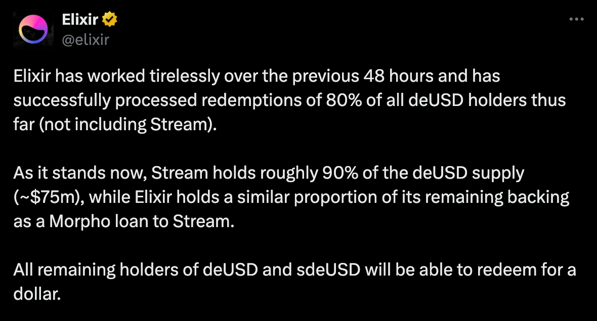 엘릭서(Elixir)의 자체 스테이블코인인 deUSD도 큰 영향을 받았다. 스트림이 전체 deUSD 공급량의 약 90%(약 7,500만 달러)를 보유하고 있었다. 정상적인 운영이 불가능해진 엘릭서는 결국 프로젝트 종료를 선언했다. xUSD에 이은 deUSD 붕괴는 즉각적으로 디파이 생태계 전반으로 충격을 확산시켰다.