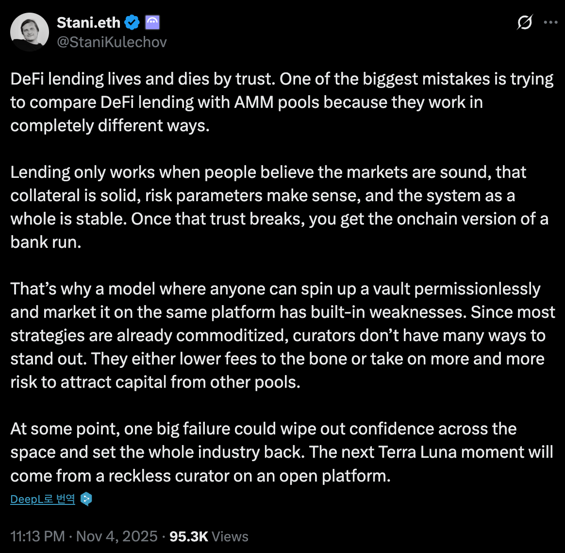 AAVE는 이번 리스크 큐레이터 이슈와 정반대 구조에 있었다. 이 때문에 AAVE의 Stani Kulechov가 직접 나서 독립 볼트 구조를 비판하고 있다. 그는 큐레이터들이 차별화를 위해 과도한 리스크를 떠안게 되고, 한 번의 큰 실패가 전체 생태계의 신뢰를 무너뜨릴 수 있다고 지적했다.