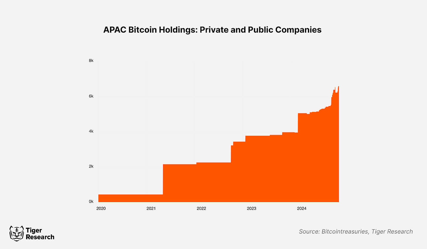然而,目前亚洲企业在比特币市场的参与度仍然较低。根据统计,亚洲公司持有的比特币总量占全球的比例不足 1%,主要原因在于许多国家的监管限制。例如,在韩国,企业无法在加密货币交易所开设账户,同时也面临投资海外比特币 ETF 或推出与加密货币交易相关基金的诸多障碍。因此,这些企业几乎无法通过正式渠道投资比特币。