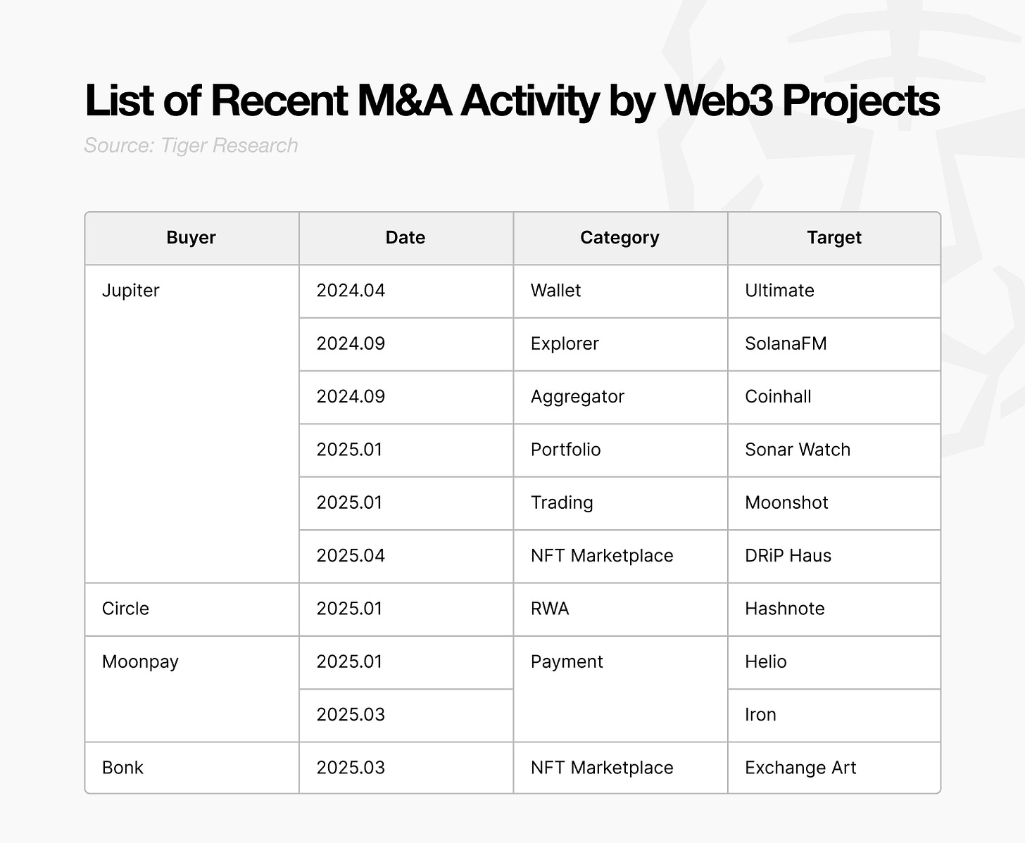 특히 적극적인 인수합병을 통한 수직 계열화는 생태계 내 주요 밸류체인을 통합하는 형태로 전개되는데, 이는 산업이 성숙 단계로 접어들며 경쟁 심화로 인한 필연적 변화다. 시장 점유율 확보를 위해 사용자 경험을 통합하고 서비스 간 시너지를 창출하는 것이 필요해지고 있기 때문이다. 대표적으로 주피터(Jupiter)는 솔라나 생태계 전반의 트레이딩 관련 기능을 통합해 기업형 구조로 전환되고 있다. 주피터는 밈코인 거래 앱인 문샷(Moonshot), NFT 마켓플레이스 드립 하우스(DRiP Haus), 가상자산 투자 포트폴리오 앱 소나와치(SonarWatch)를 인수, 가상자산 결제 기업인 문페이(Moonpay)는 솔라나 기반 결제 앱인 헬리오(Helio)를, 스테이블코인 발행사 써클(Circle)은 해시노트(Hashnote)를 인수하는 등 전략적 확장에 나서고 있다.