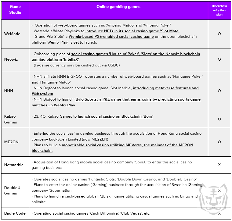 Major Korean game companies such as WeMade, Neowiz, and NHN are actively adopting blockchain technology for online gambling content targeting overseas markets. In addition, Kakao Games announced the launch of a social casino game utilizing its blockchain 'Bora' in the fourth quarter of this year.