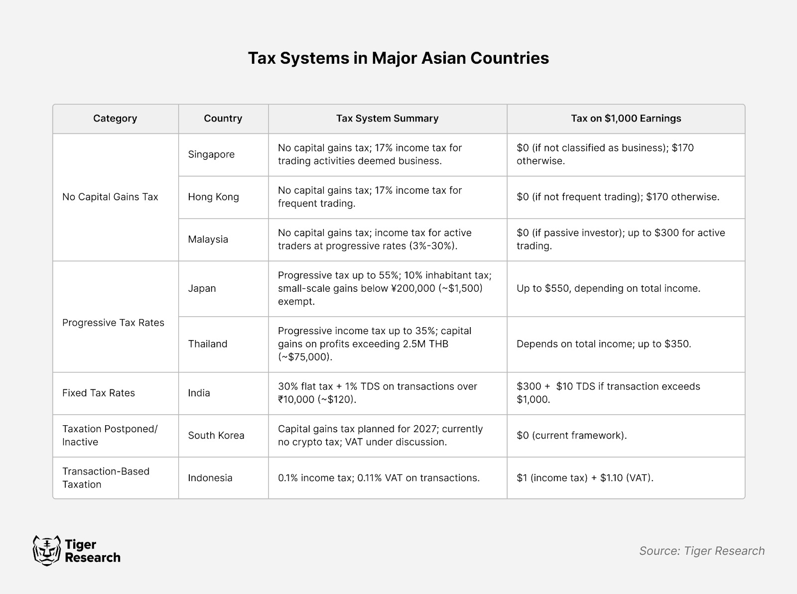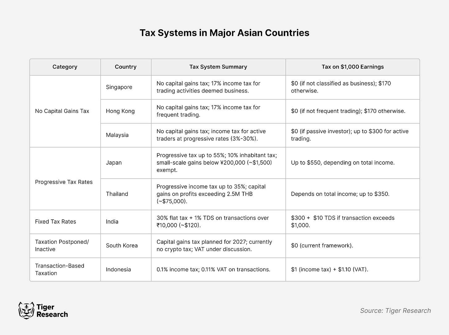 본 보고서는 타이거리서치가 작성했으며, 2024년 아시아 국가들의 암호화폐 과세 정책과 시장 발전에 미치는 영향을 분석했다.