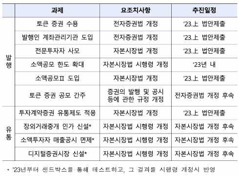 이러한 흐름 속에서 한국 또한 관련 법안을 발의하였고 금융위원회를 중심으로 정비방안까지 배포되었다. 뿐만 아니라 금융 샌드박스를 통한 조각투자, 금융사를 중심으로 얼라이언스가 마련되는 등 주요 규제 기관을 비롯하여 산업에서 선제적인 준비 과정이 이뤄져왔다.