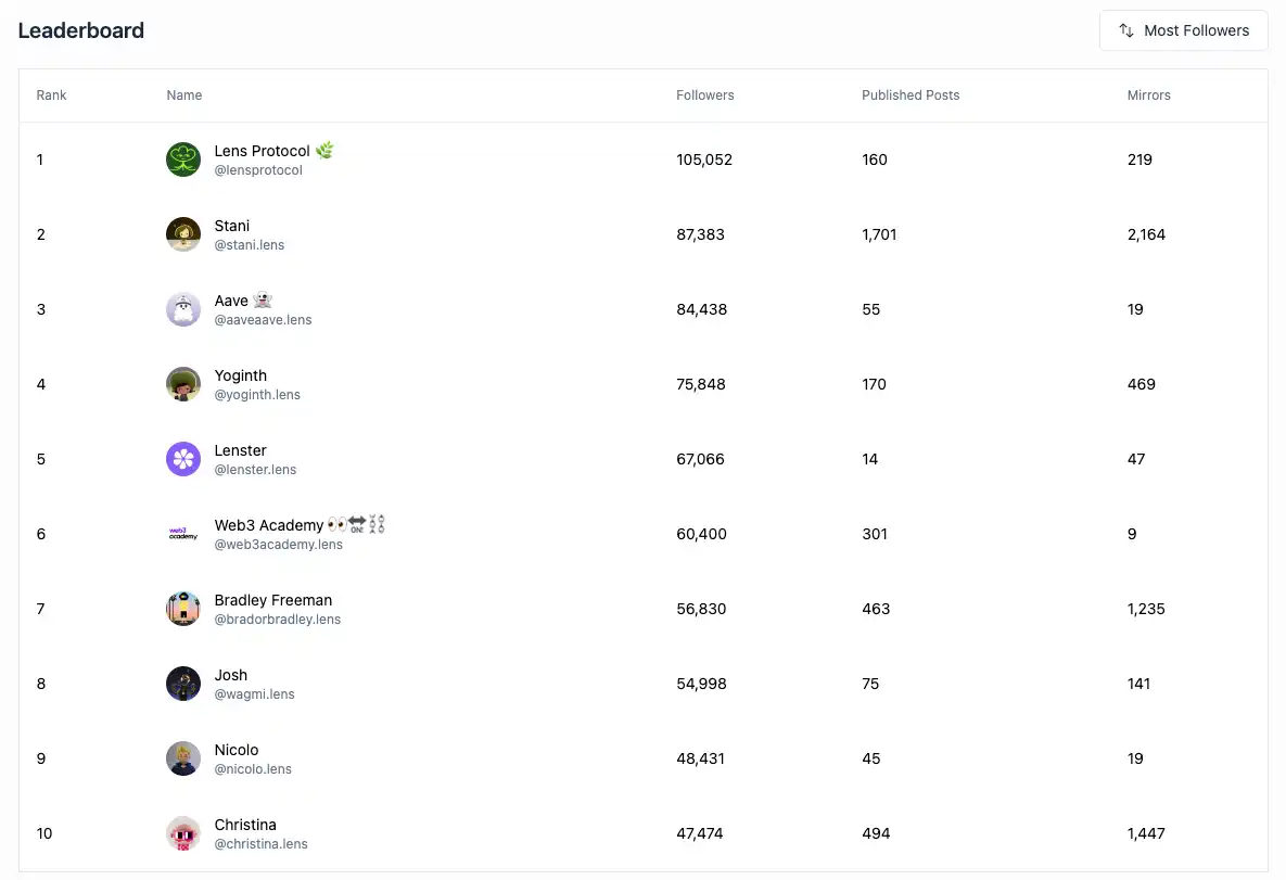 According to Lens Analytics data, the number of posts uploaded using Lens Protocol currently stands at 3.5 million, with 1.5 million comments. This is still a relatively small figure compared to Instagram's daily post count of 95 million. Additionally, the top 10 users in terms of follower count are all affiliated with Lens Protocol, and there are no native influencers born within the service yet. However, considering that the service was launched in 2022 and is still in its early stages, the performance of Lens Protocol can be considered impressive. It is also encouraging to see many services utilizing Lens Protocol.