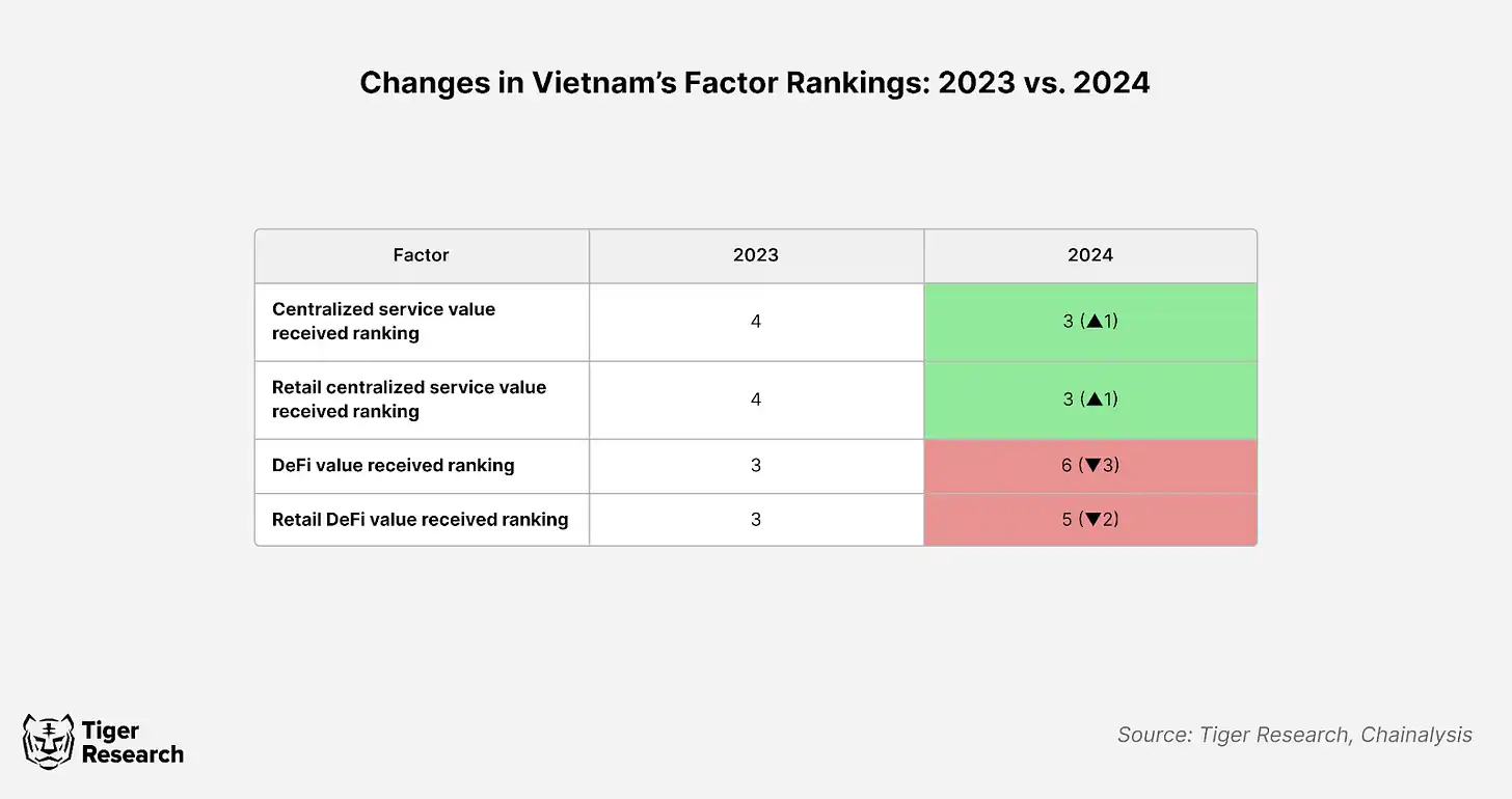 Vietnam saw a drop in its overall ranking, moving from 3rd in 2023 to 5th in 2024 on the Global Crypto Adoption Index. This decline is primarily due to increasing competition from regional players like Indonesia, which has accelerated institutional adoption and introduced clearer regulatory frameworks. While Vietnam has managed to slightly increase the rankings in centralized service value, its position in DeFi has stagnated, indicating a slower pace of Web 3 development compared to its peers.