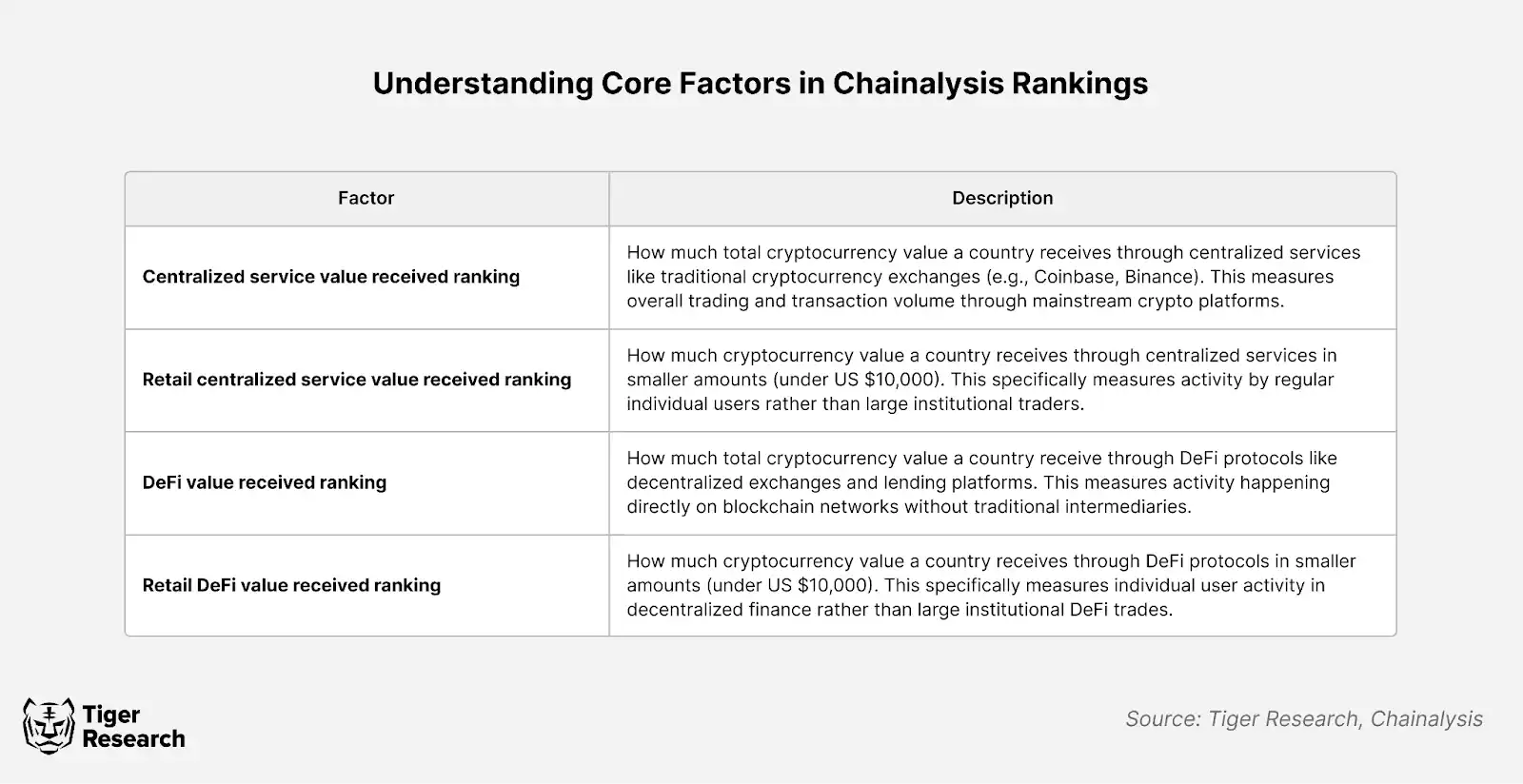 Chainalysis calculates this index based on four core factors: 1) centralized service value received ranking, 2) retail centralized service value received ranking, 3) DeFi value received ranking, and 4) retail DeFi value received ranking.