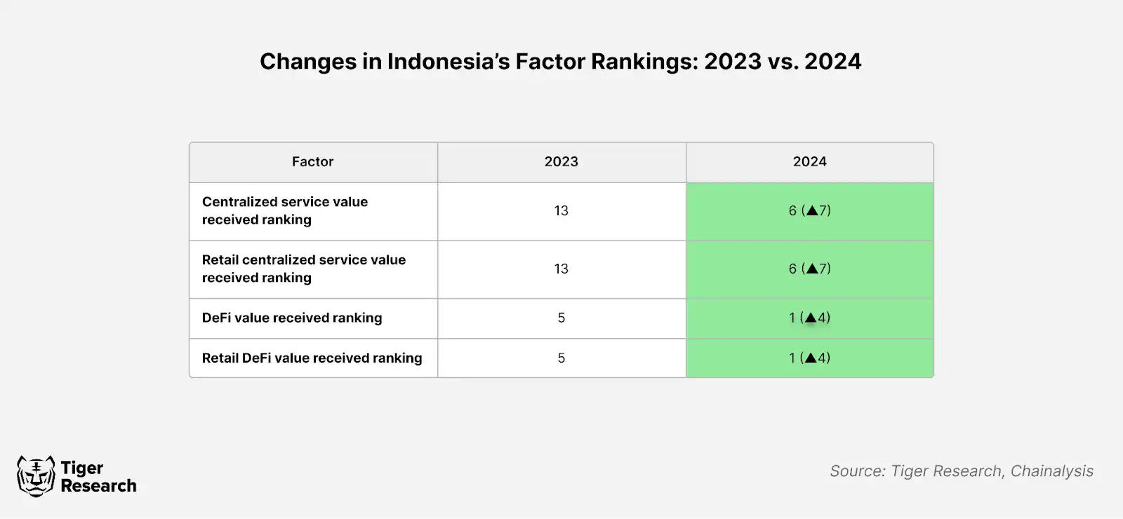 Indonesia has made a significant leap in the Global Crypto Adoption Index, advancing from 7th place in 2023 to 3rd in 2024, with notable improvements in both centralized services and DeFi rankings. Continued growth in centralized services this year could further elevate its adoption ranking in the coming year.
