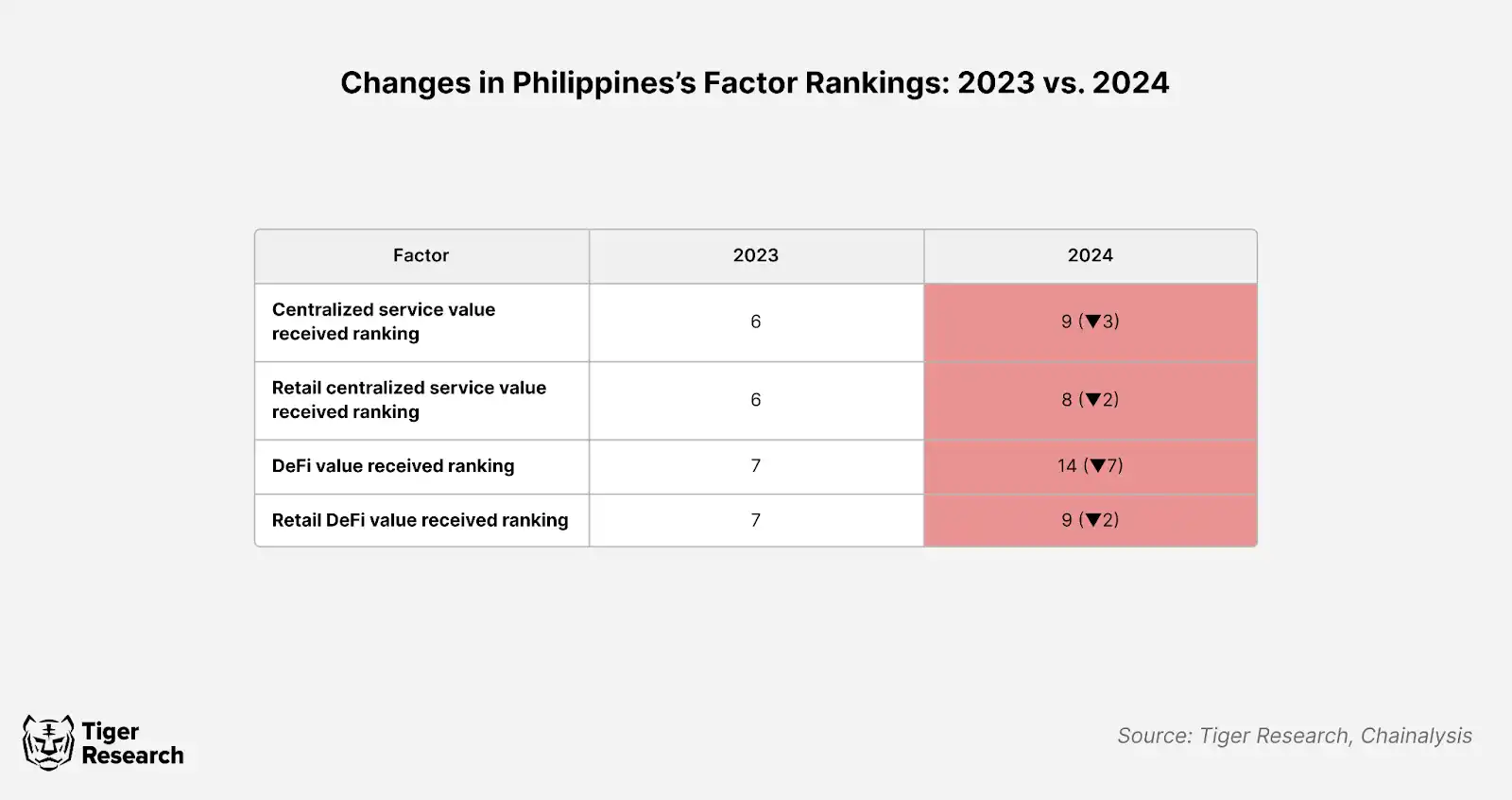 The Philippines, despite its consistent engagement with cryptocurrency, saw a slight decline in the Global Crypto Adoption Index, moving from 6th place in 2023 to 8th in 2024. This drop is largely due to the country’s continued reliance on CEX, which accounted for 55.2% of transaction value in 2024, a slight increase from the previous year. While the Philippines has maintained a strong focus on structured CEX solutions, other countries are advancing in DeFi and institutional trading—areas where the Philippines has yet to gain significant traction. As countries like Indonesia advance with stronger institutional adoption and regulatory clarity, the Philippines has faced challenges in keeping pace.