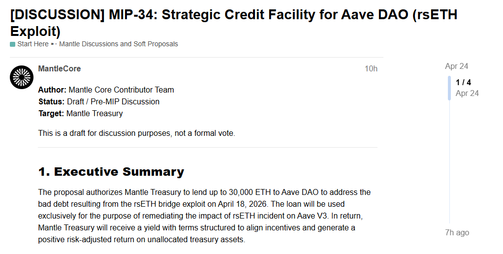 Each DeFi United participant is contributing differently, depending on their position. Lido, EtherFi, and Golem are donating outright. Mantle is taking a different approach: a conditional loan of 30,000 ETH, structured with a Lido APR +1% interest rate, a three-year term, and delegation of 130,000 AAVE governance tokens as conditions. It stabilizes the ecosystem while securing treasury yield and governance rights simultaneously.