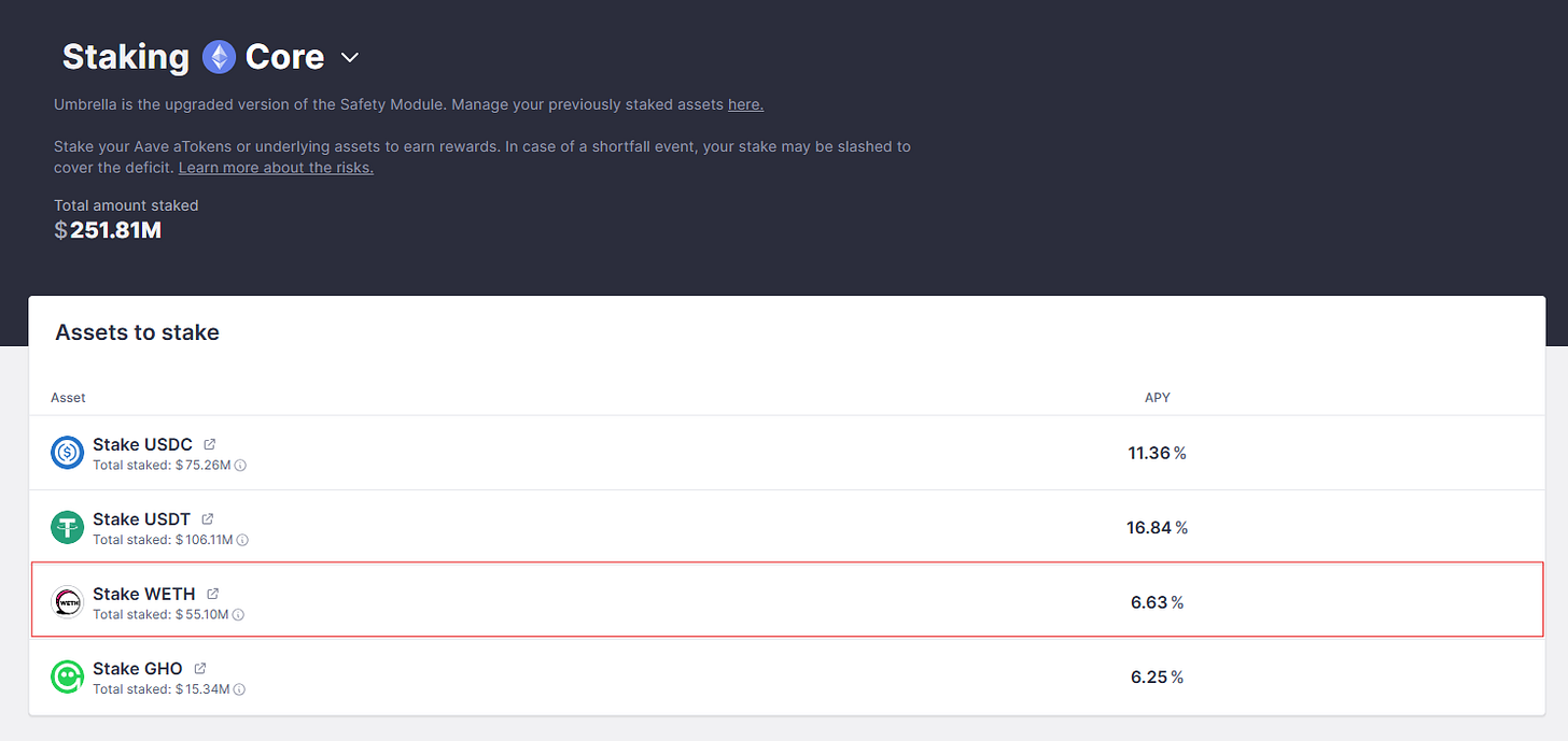 (전체 스테이킹된 자금은 $251.8 상당이지만 Umbrella는 자산별로 격리되어 있어 USDC·USDT 스테이킹이 WETH 결손을 커버하지 않음.)