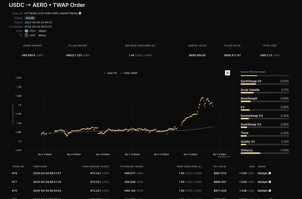 结果,Starkiller获得的AERO代币比通过OTC执行多出21.33%,而仅支付了10.71美元的网络费用。这有效地避免了执行效率可能损失20%的情况。