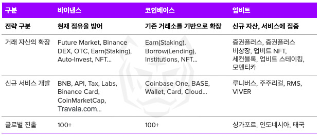 크게 거래 자산의 확장, 신규 서비스 개발, 글로벌 진출 등의 전략을 취하고 있으며 주요 코인 거래소들은 각기 다른 모습을 보이나 아직까지 수익 구조가 성공적으로 개선된 곳은 없는 것으로 보인다.