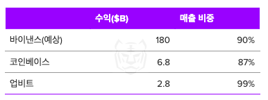 2021년 크립토 시장 활황기에 큰 수익을 기록한 주요 코인 거래소들(Binance, Coinbase, Upbit)의 대부분 매출은 수수료에 의존하고 있으며 수익 구조 개선을 위해 노력하고 있다.