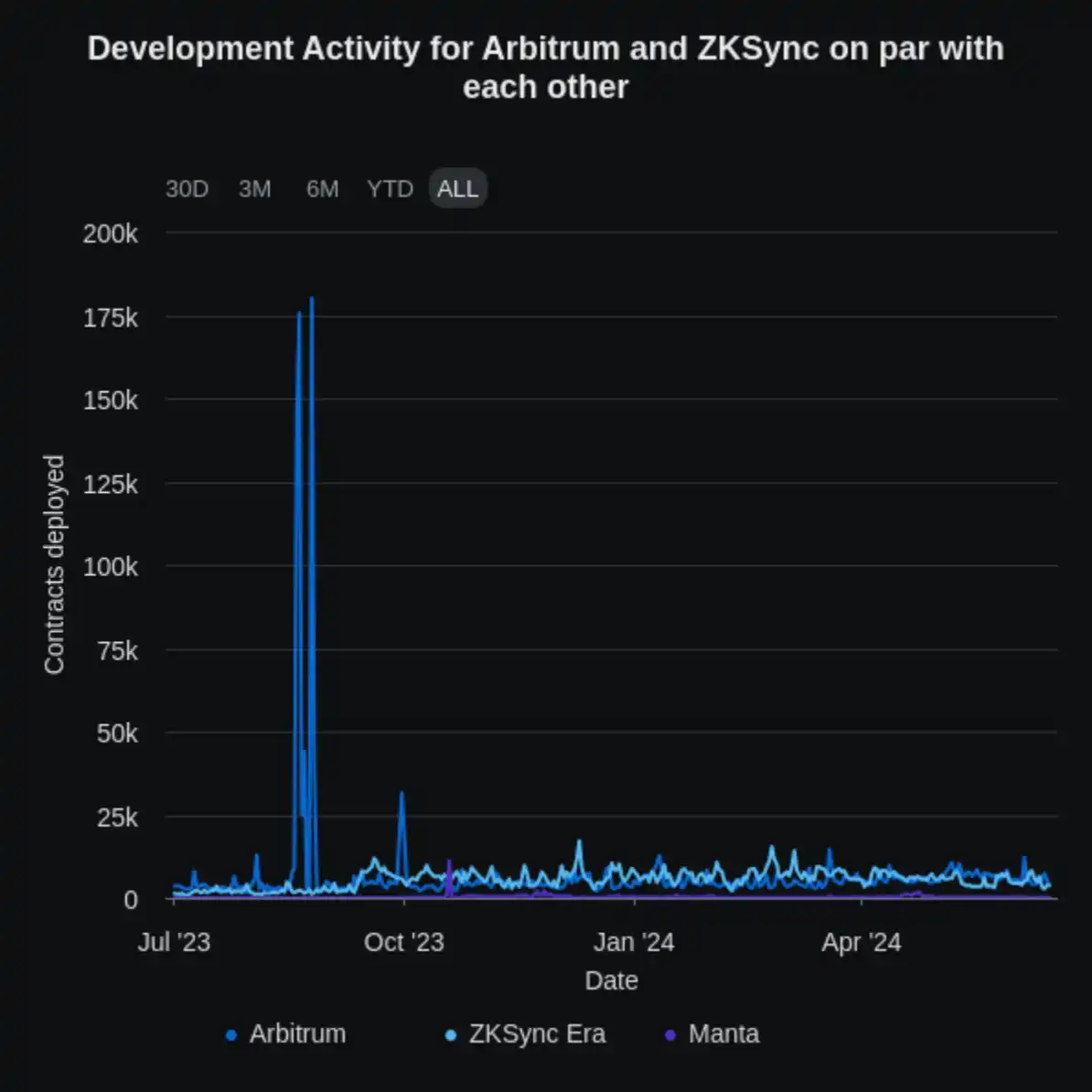 Developers need to make an informed decision to deploy, maintain, and grow a protocol on a particular blockchain. Even multichain dApps need to take a decision on which chains they would want to expand to, as it consumes time and resources that can be spent improving and growing their existing products. Moving around different chains is thus an important decision for developers compared to application end users and can be used as an indicator for gauging interest in a blockchain ecosystem. Manta whilst able to match L2s like Arbitrum and zkSync briefly in transaction fees, it was never remotely close to them in the number of contracts being deployed.