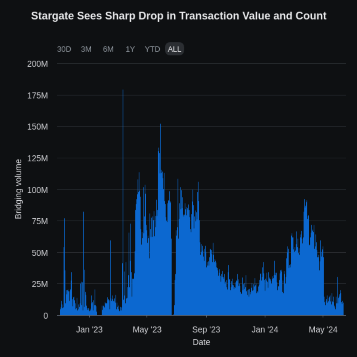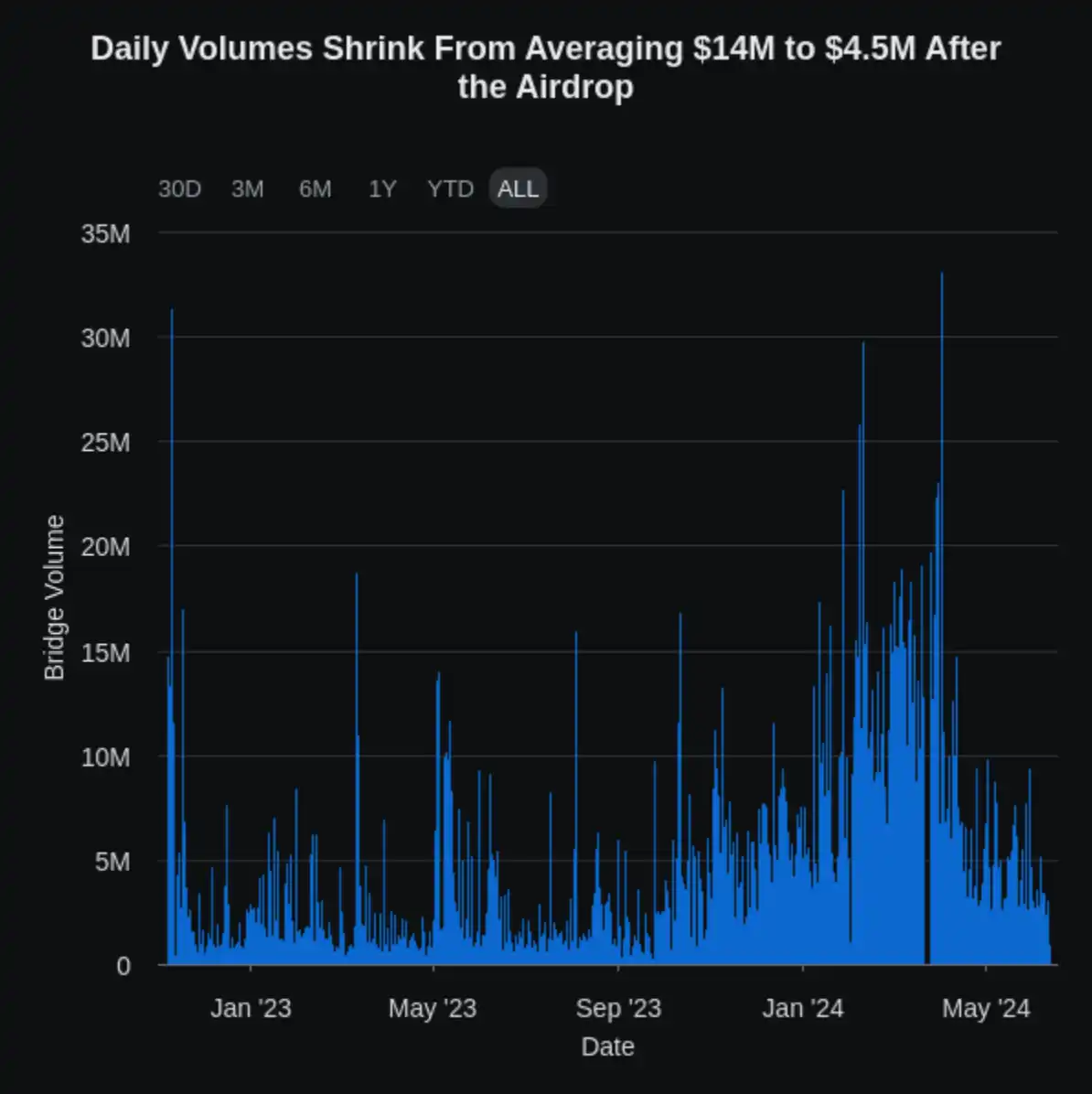 Airdrop farmers have moved to use other bridging applications like deBridge for its upcoming airdrop, leading to an overcorrection in transaction volume