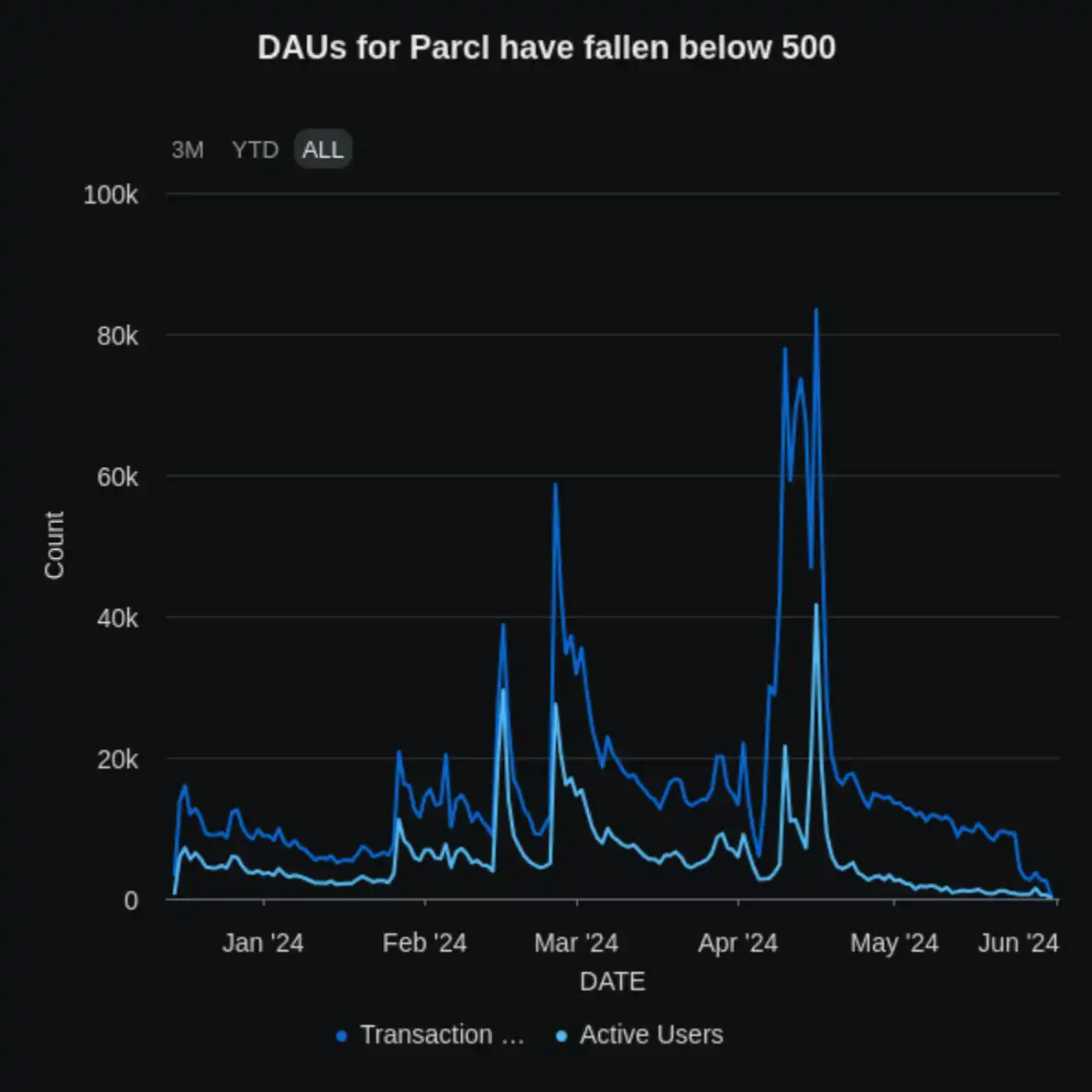 Since the airdrop distribution, the number of daily transactions and unique wallets interacting with the protocol has fallen dramatically. Recently, Parcl has averaged close to ~500 unique DAUs and about 2,500 transactions on the platform daily, a sharp falloff from the 10k+ wallets that were interacting with the protocol.