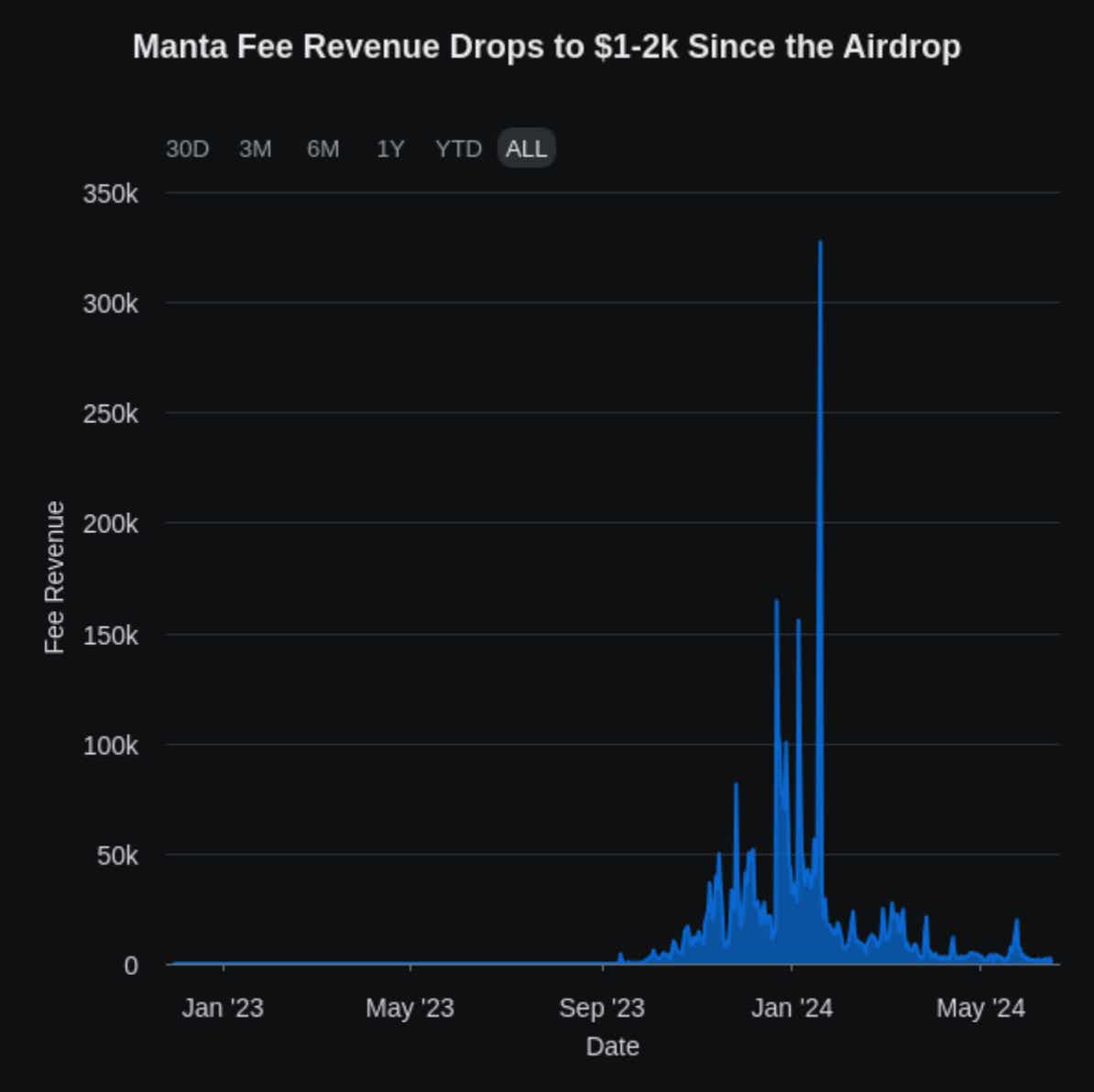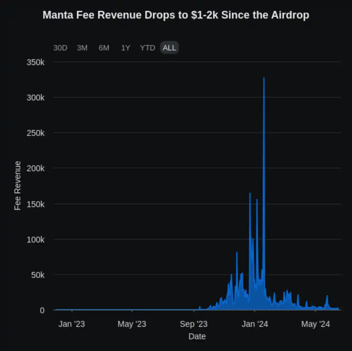 Manta Pacific ran campaigns like “New Paradigm” and “Into the Blue” and added gamification around their NFTs that were later converted to token allocations. During the months of December and January, Manta was generating fees comparable to Arbitrum and zkSync even though it was using Celestia as its data availability layer. But their campaigns ended up attracting more airdrop farmers than actual users that would return to the applications post airdrop. Fees collected from transaction processing have dropped more than 95% from ATH, and Manta Pacific has not been able to generate more than $20k in daily fees since the last week of March.