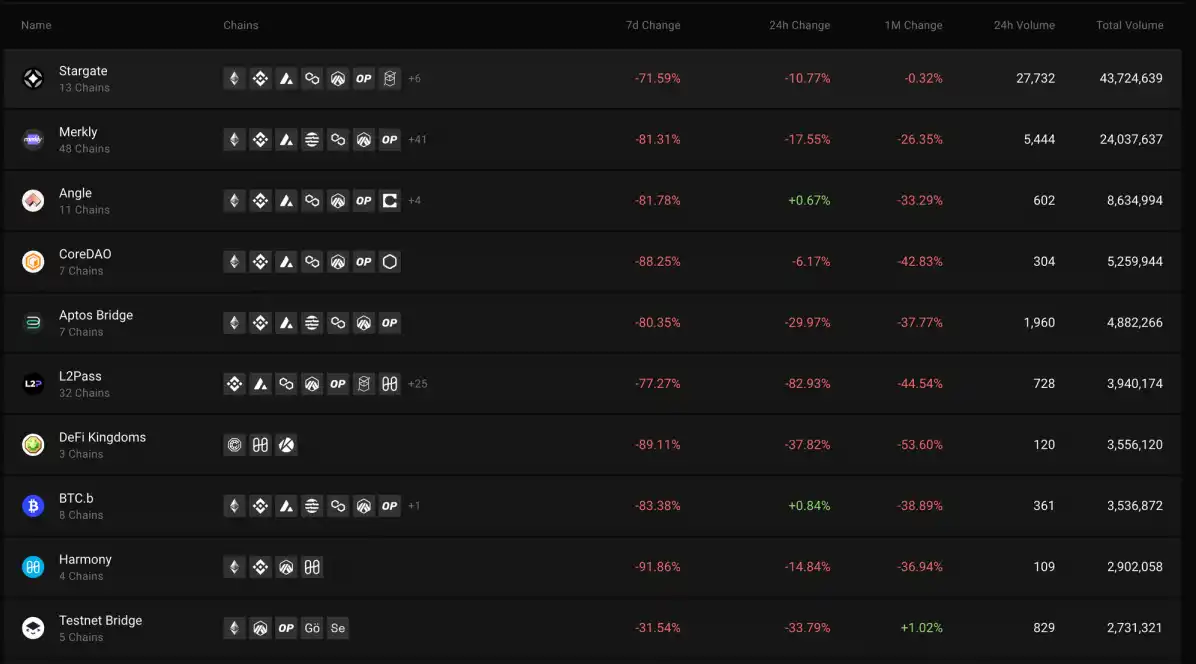 Purely examining the dip in messages relayed paints an incomplete picture. To benchmark the comparative performance, we can see that net bridging volume across all bridges dropped to $8.3B in May from $10.1B in April—a 17.8% drop. At the same time, LayerZero-powered Stargate’s bridging volume decreased from $1.67B to $406.7M—a 75% drop in transaction volume.