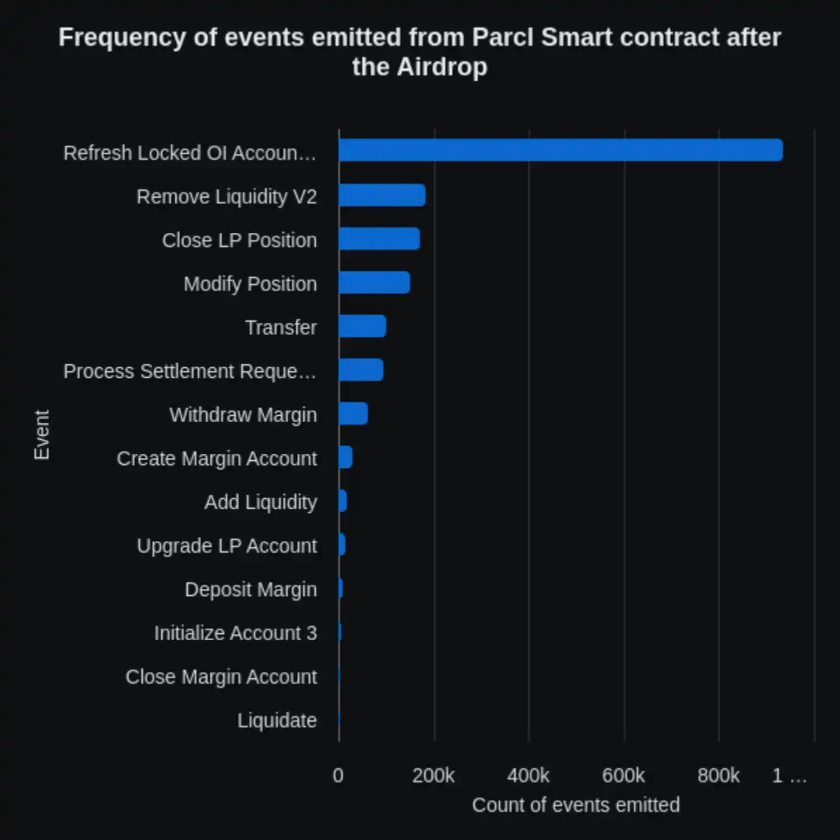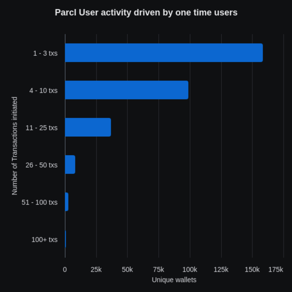 Over 158k wallets have interacted with the Parcl smart contracts, i.e., depositing into the Liquidity pool, withdrawing funds, opening a trade position, etc., fewer than three times. It is likely that most of these wallets interacted with the protocol for farming the airdrop with no intention of continued usage post-snapshot.