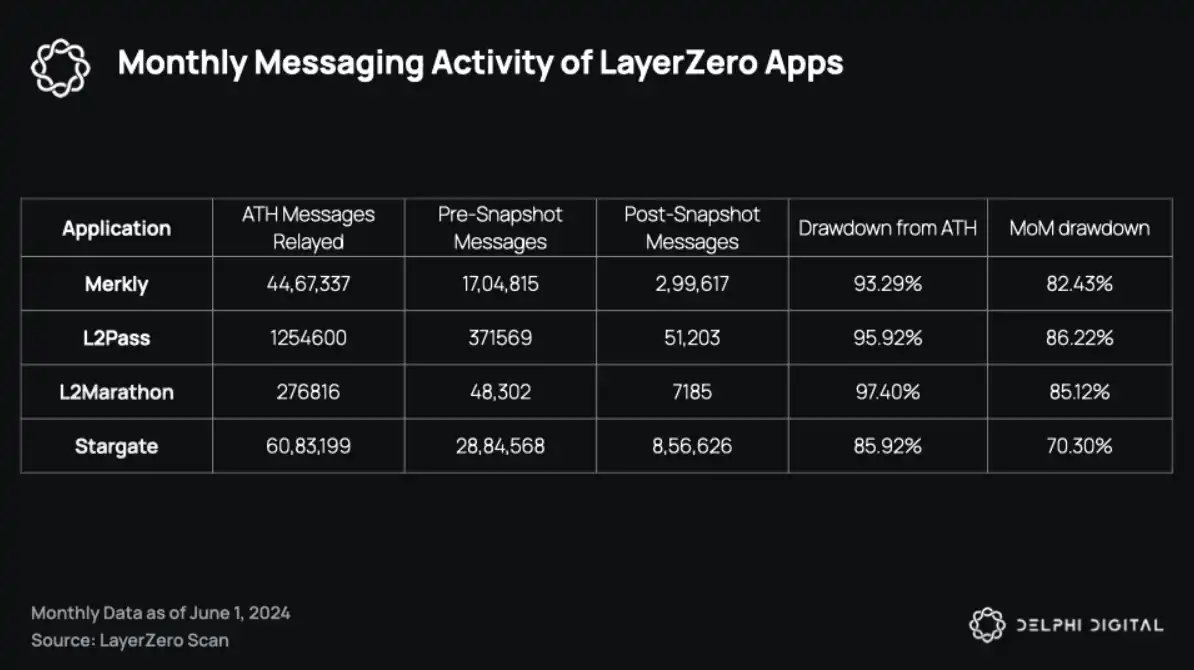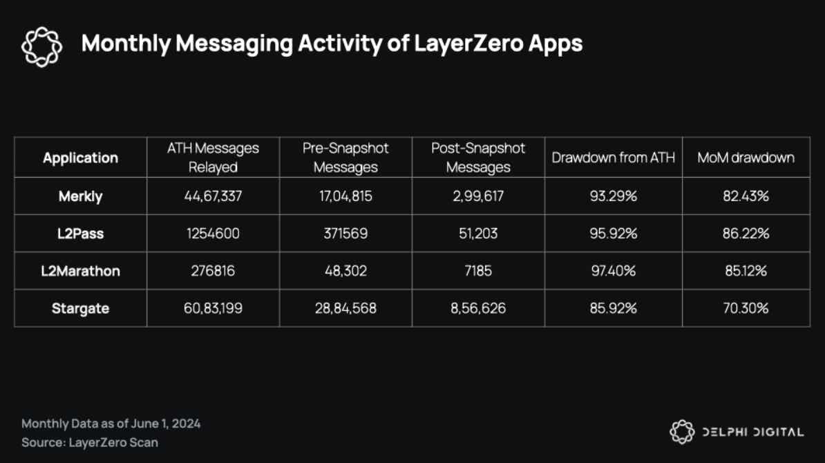 The monthly usage metrics for these dApps show a sharp decrease after the snapshot date. The LayerZero team has correctly categorized many of the transactions originating from these apps as Sybil-driven, but the large drop in activity has hit all LayerZero-based applications.