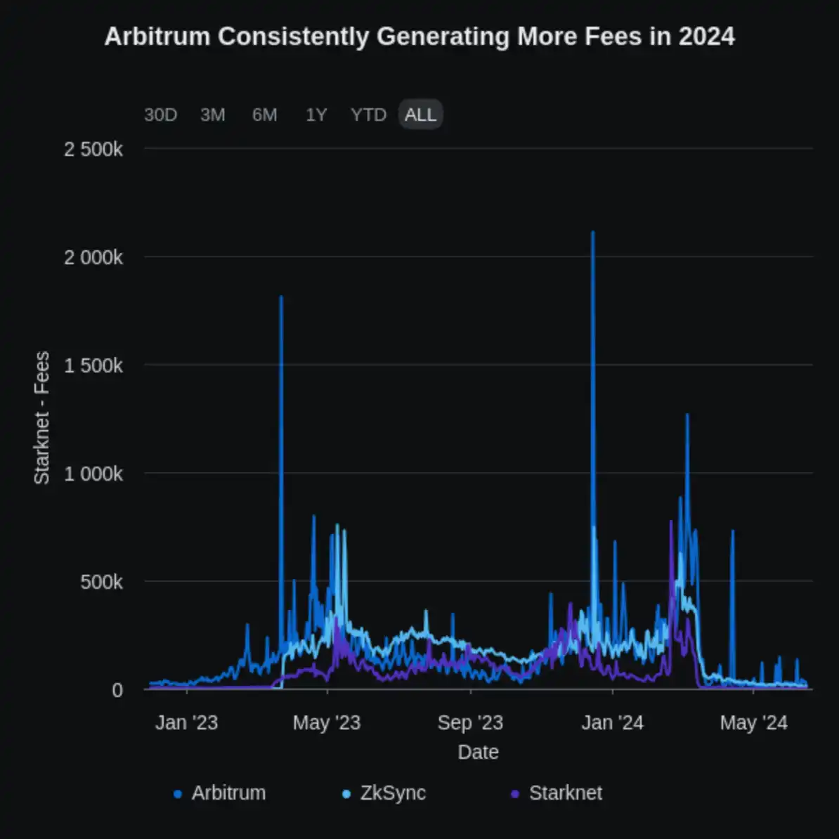 In a pre-EIP 4844 Ethereum, Arbitrum had been able to more than triple the fees they were collecting in a year from their airdrop, as fees grew from $120k-170k in March 2023 to $480k-$1.2M in March 2024. zkSync and Starknet did lead in fees collected compared to Arbitrum in the months following the ARB airdrop.