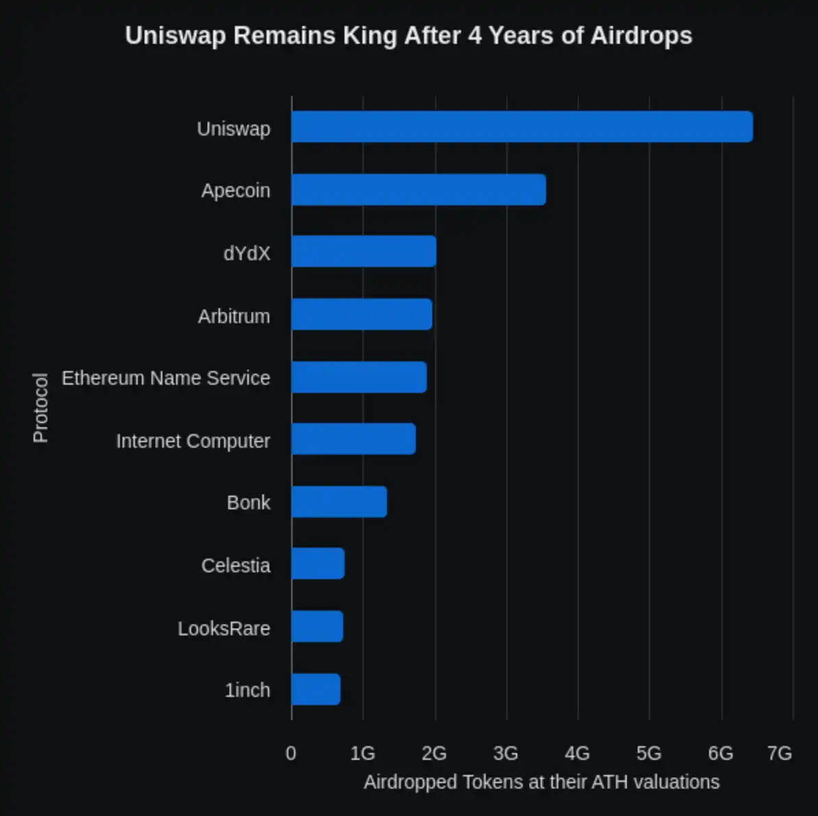 Not all airdrops are equal. Some, such as Internet Computer and APE coin, have mostly trended downward in price since the airdrop. Meanwhile, airdrops such as BONK (280x), TIA (2.5x), and UNI (2.9x) are trading at multiples of their launch valuations.