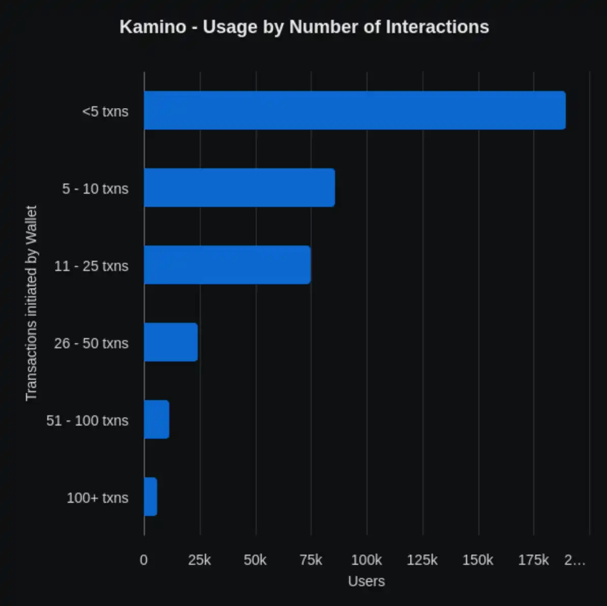About 190k of the total 390k wallets that have interacted with Kamino Protocol have initiated fewer than 5 transactions. A large fraction of these wallets are likely Sybil operations or individual airdrop farmers.