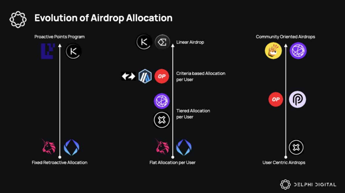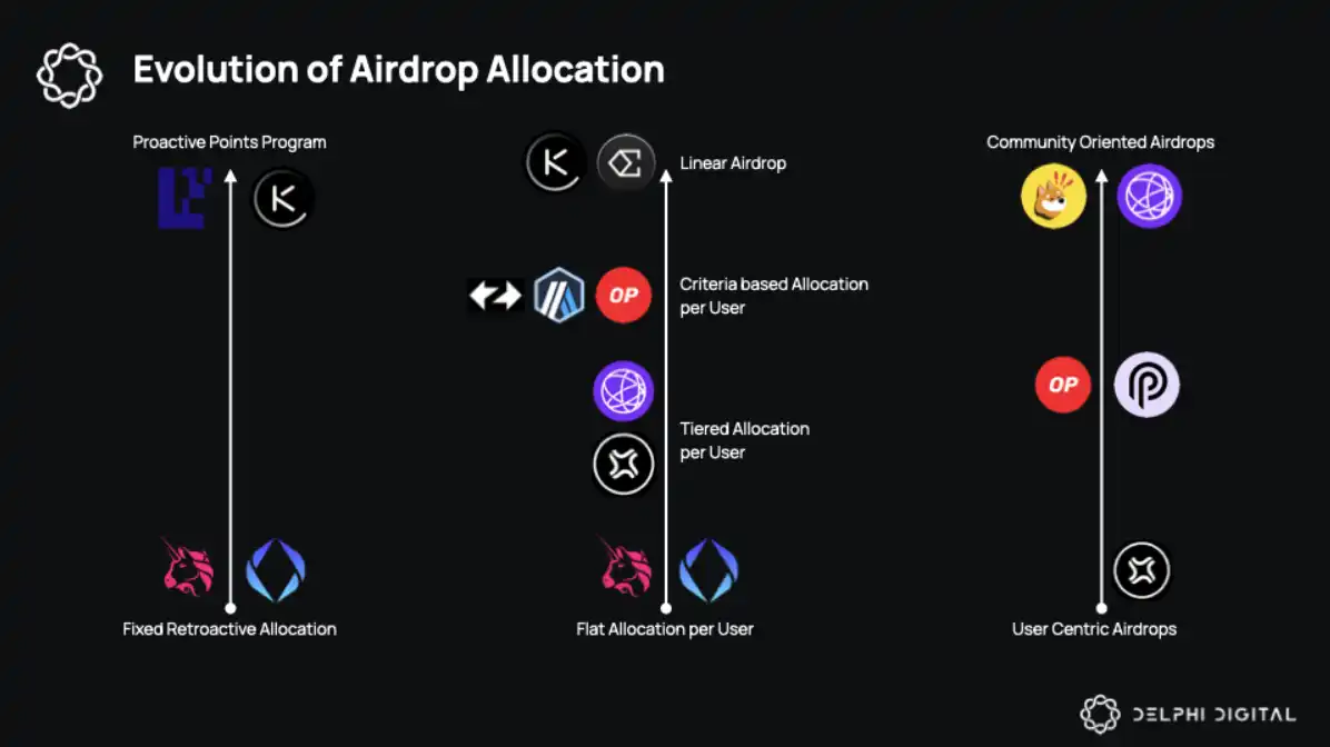 The UNI airdrop started with a flat reward (400 tokens) for each swapper. Then, we saw tiered airdrops, where protocols started to make a general tiered distinction between users, and the airdropped amount within each tier remained constant (Jito). The Optimism team popularized multiple criterion-based airdrops, with qualifying users receiving incremental tokens for each criterion they satisfy. This methodology was utilized by many protocols, including Arbitrum and zkSync. We now observe most teams using linear allocation in their airdrop strategies, with Ethena and Kamino being recent examples of this approach.