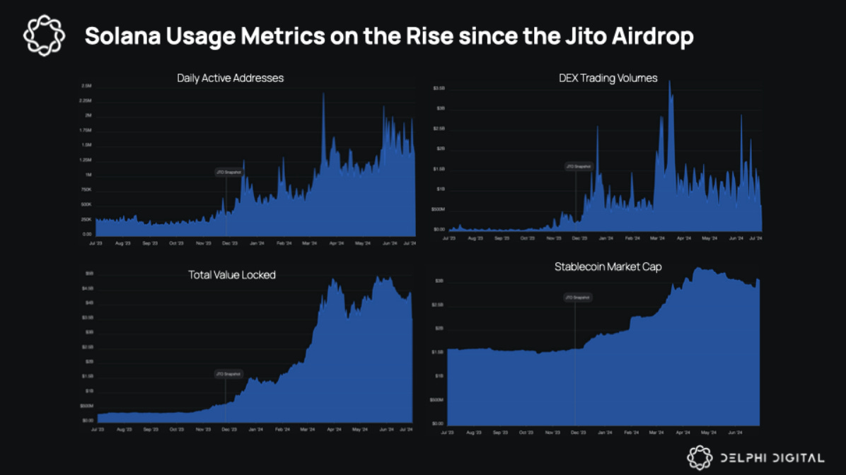 Jito’s airdrop is an extreme outlier, but it is an example of how one airdrop can kickstart exponential growth for an entire ecosystem. Solana’s DEX volumes now rival Ethereum Mainnet. DAUs and transaction counts exceed Ethereum Mainnet, and TVL has been on a constant climb since the End of November, i.e. since the Jito Airdrop.
