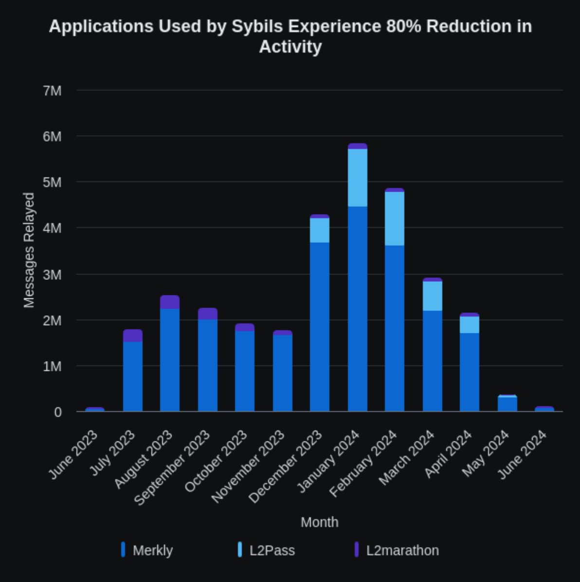 The number of messages relayed for Stargate, the flagship application of the LayerZero protocol, also dropped by 70% in the month following the snapshot announcement. The applications labeled as Sybil dominated have dropped between 82-86%. There are 2 factors that explain the rapid decrease in volume across all LayerZero applications –