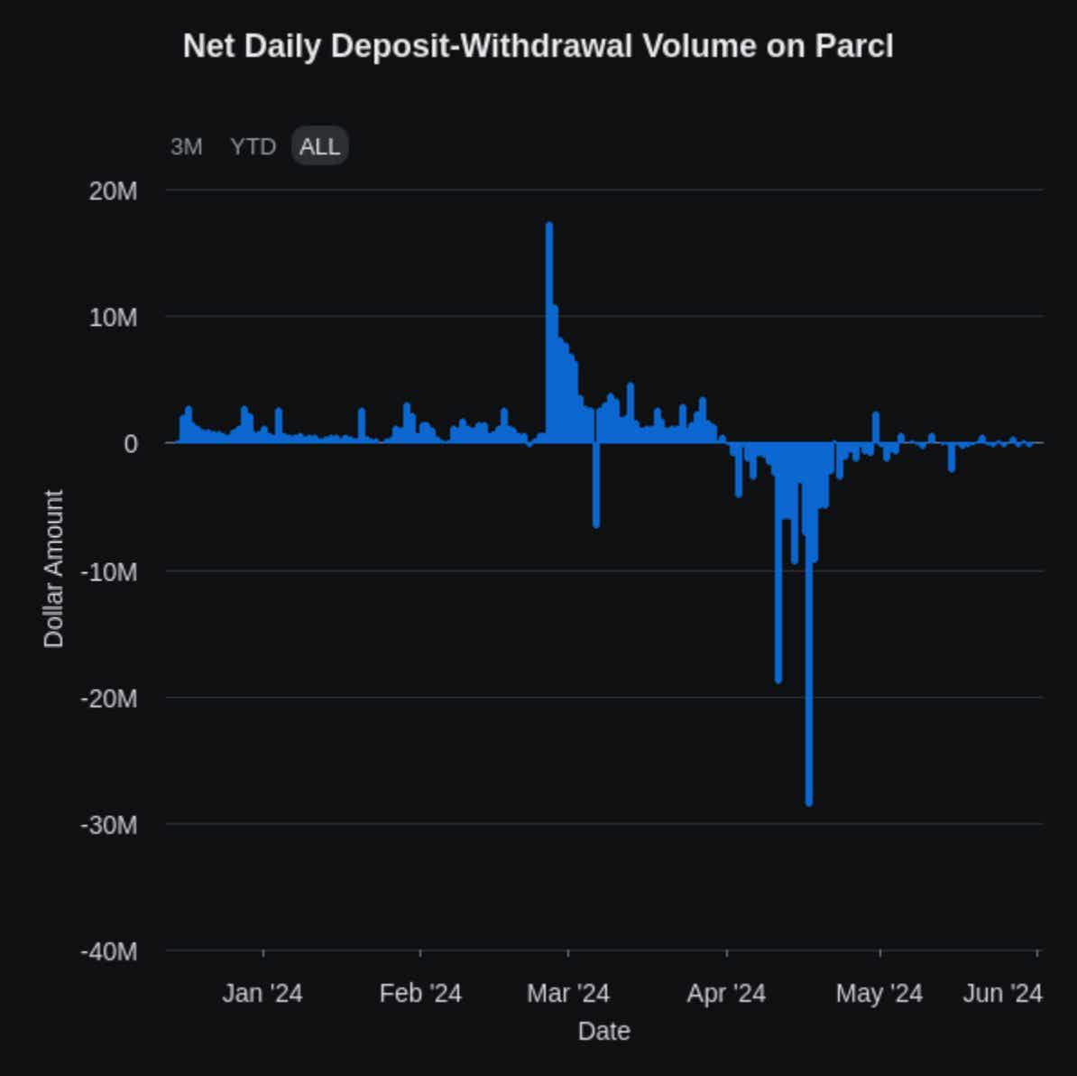Users have mainly been withdrawing funds from Parcl after the airdrop, with less than 12 days of net inflows since the announcement date. The average magnitude of withdrawals/outflow days ($2.25mn) also exceeds the average deposit/positive-inflow days ($447k) by a factor of 5x. TVL has shrunk by 74% to $47mn since the airdrop.