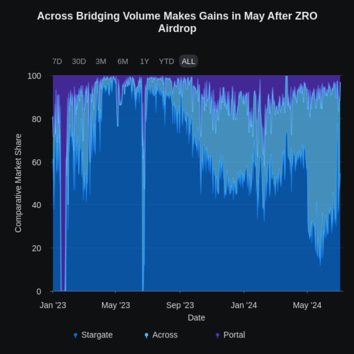 After these major airdrop announcements, a lot of bridging-related activity migrated to Across in the month of May, when Across did four times the combined volume of the flagship bridges for LayerZero and Wormhole. With the launch of Stargate V2 at the end of May, Stargate has rebounded in volume and has gradually flipped Across for the position of the leading bridge on June 27th.