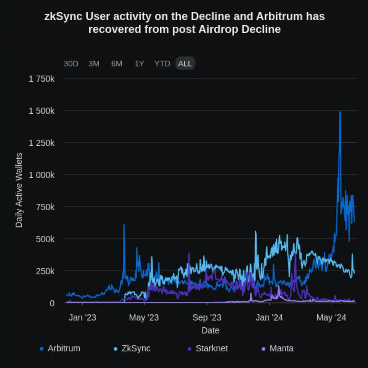 On a positive note, the transaction count and fees generated on Manta began a steady increase in the first week of June. For Manta, the number of active users on the chain has dropped below 10k, with an average of 8+ daily transactions per active wallet on the network representing a narrow base of highly active users. On chains like Arbitrum and zkSync, the average transaction count per user ranges between 2-4. Arbitrum’s recent growth in active users helps it maintain a 50% lead over Base as the most active Layer-2 by DAUs.