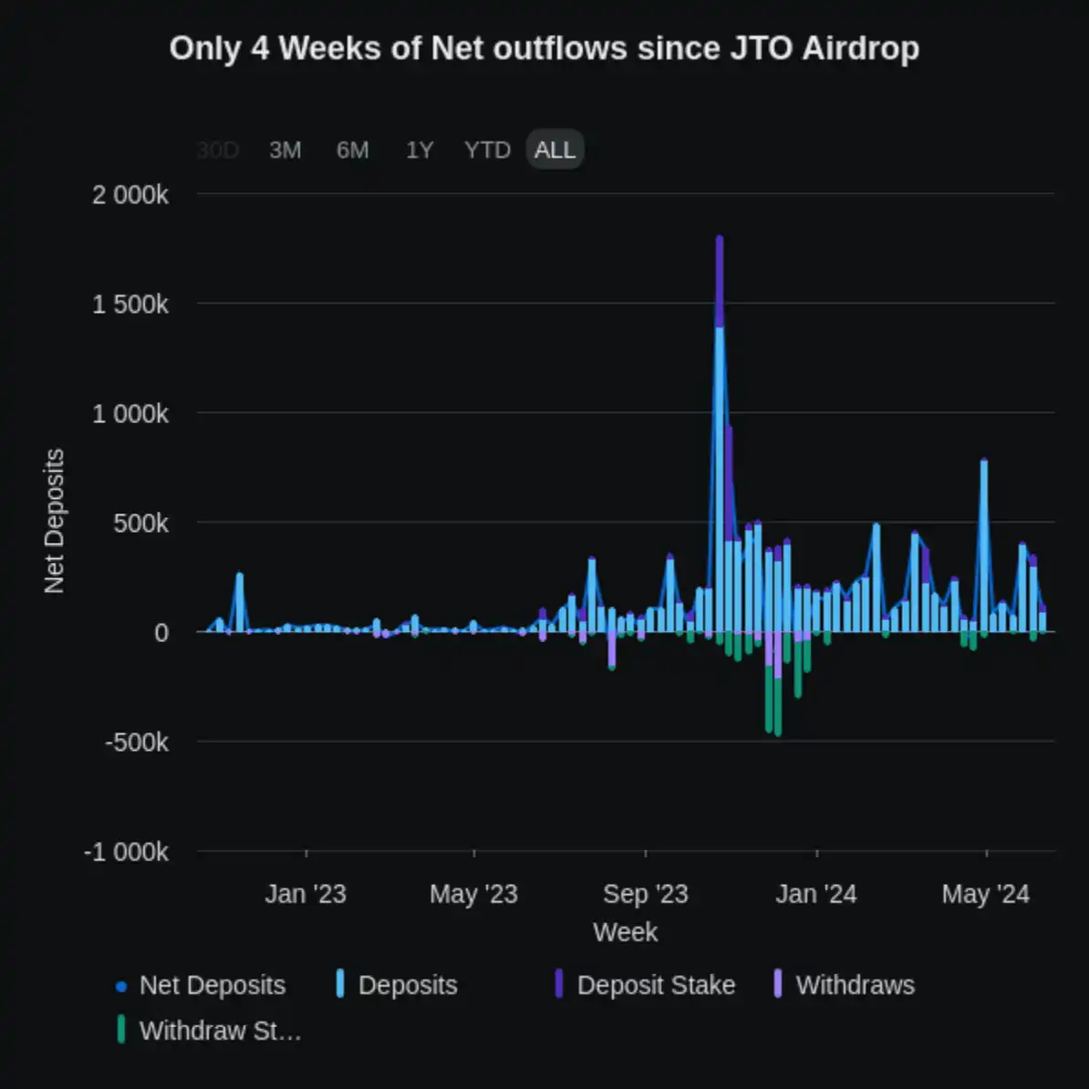 From the week Jito announced their airdrop, they’ve seen 24 weeks of net SOL inflows and 5 weeks of outflows. On an average inflow week, Jito receives 227k SOL deposits, and during an average outflow week, the protocol sees 63k SOL exiting from their stake pools. This shows that until now, an average week of