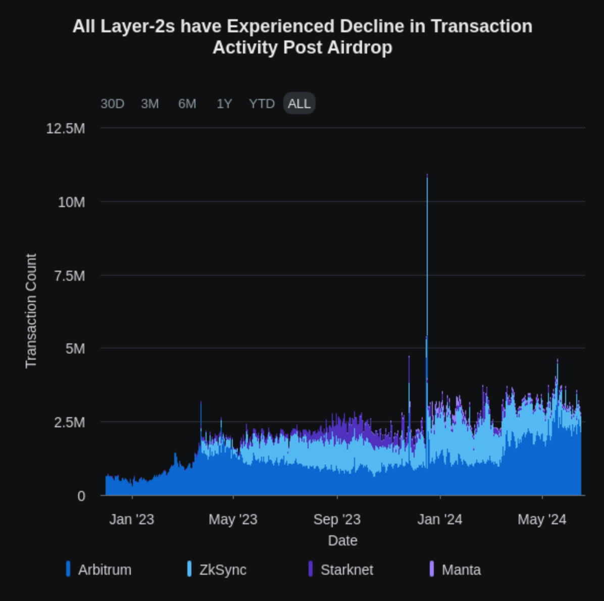 zkSync has been showing signs of a slowdown in transaction activity since April, even before the snapshot had been announced – possibly due to certain sybil activity wrapping up on the L2 and moving to farm newer protocols. Arbitrum was the most active Layer-2 ecosystem around its airdrop in March 2023, and it was still able to more than double its daily transaction count. Starknet and Manta Pacific have seen a drastic drop in transaction activity, with both L2s facilitating less than 100k transactions on most days in the past 2 months (i.e. Both these L2s have a current scaling factor of less than 0.1).
