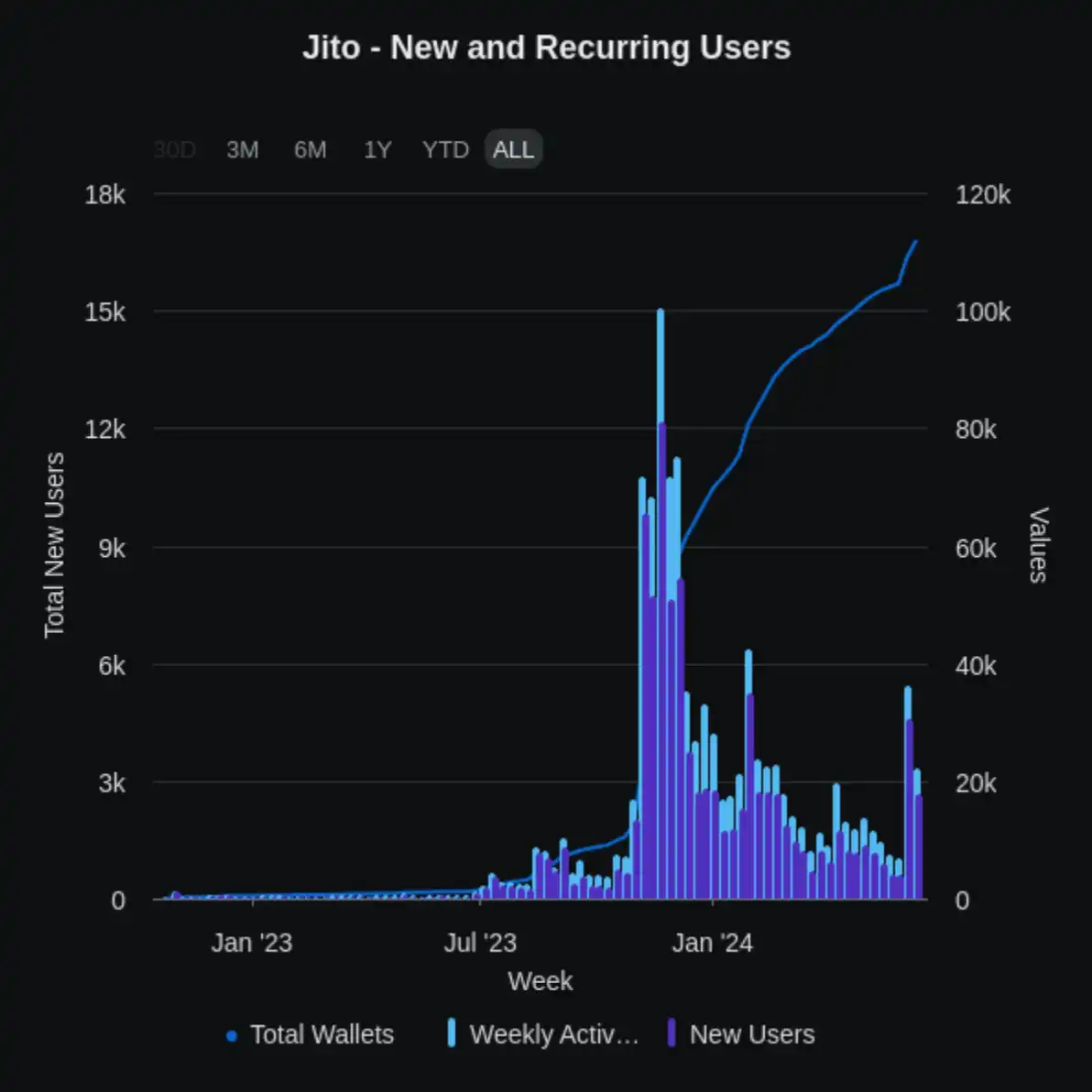 The number of new users (wallets) interacting with Jito has been on par with the number of recurring users, signaling the interest in using Jito even after the airdrop.