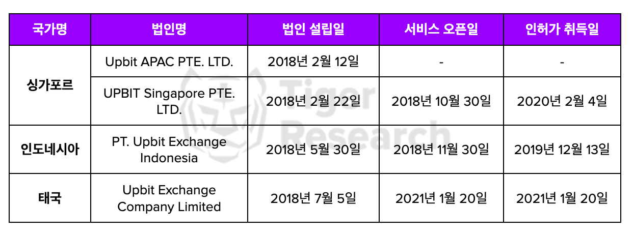 업비트의 해외 진출도 기대되는데, 2018년 싱가포르 내 업비트 APAC 지사 설립 이후, 동남아를 중심으로 공격적으로 확장하는 추세이다. 실제로 싱가포르, 인도네시아, 태국에서 가상자산 사업자를 인가받아 거래소를 운영 중에 있다. 이 같은 업비트의 해외 진출 노력이 가시적인 성과로 까지 이어졌는데, 현재 글로벌 가상자산 거래량 기준 바이낸스 다음으로 가장 많은 거래량을 기록하여 글로벌 2위 거래소로서 자리를 굳게 지켜나가는 추세이다.
