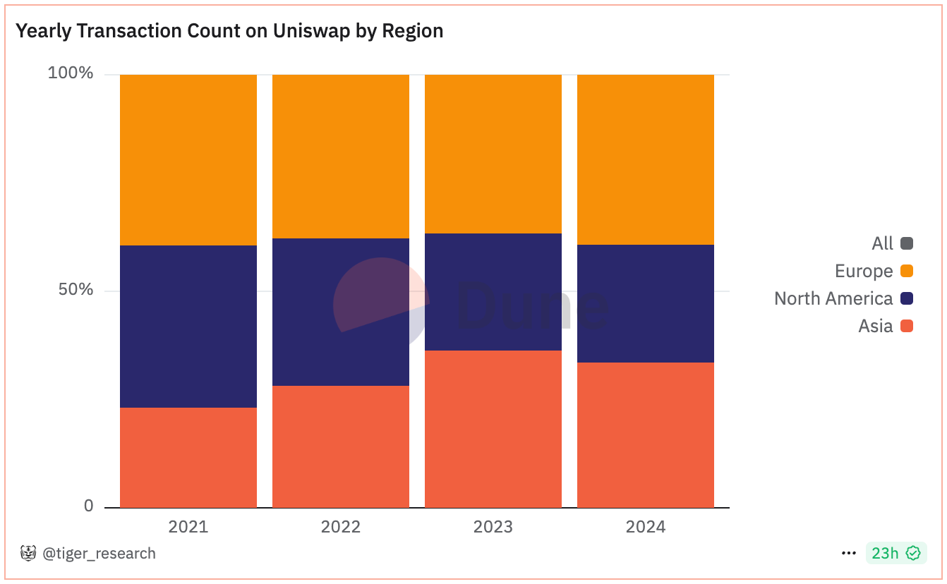 유니스왑의 지역별 트랜잭션 데이터를 분석한 결과, 아시아 지역의 활발한 참여가 두드러진다. 2021년부터 2024년까지 전체 트랜잭션에서 아시아 지역이 상당한 비중을 꾸준히 유지하고 있으며, 전반적인 거래 활동도 증가세를 보이고 있다.