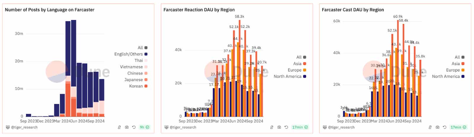 파캐스터 내 아시아 사용자들의 활발한 활동이 웹3 생태계에서 주목받고 있다. DAU(Daily Active Users) 분석 결과, 아시아 지역 사용자들은 북미, 유럽 대비 높은 활동성을 보이며, 웹3 산업의 주 언어가 영어임에도 베트남어, 중국어, 일본어, 한국어 등 현지 언어 포스트가 꾸준히 증가하고 있다. 이러한 현상은 아시아의 웹3 성장이 단순한 전망이 아닌 실제 온체인 활동으로 입증되고 있으며, 아시아가 웹3 실사용 측면에서도 선도적 역할을 하고 있음을 보여준다.