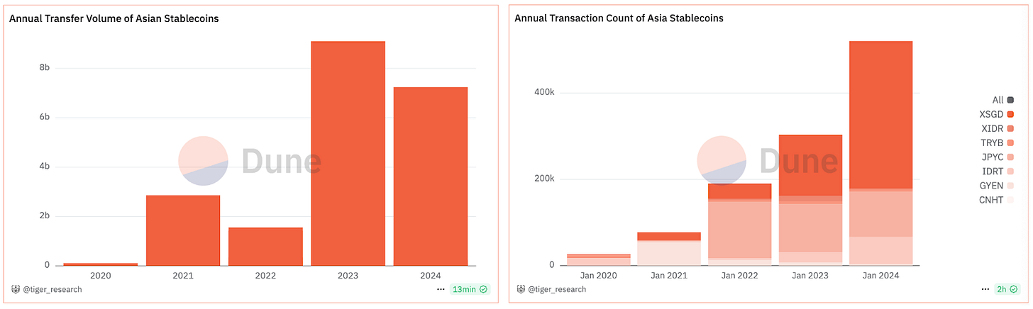 아시아 시장에서 스테이블 코인의 활용이 꾸준히 증가하고 있다. 이는 주목할 만한 현상인데, 스테이블 코인이 웹3 기술 중 가장 확실한 제품 시장 적합성(Product Market Fit)을 보여주고 있는 분야이기 때문이다. 실제로 온체인 데이터를 살펴보면 아시아 지역 기반 스테이블 코인의 전송량이 약 80억 달러까지 급증하였으며, 트랜잭션 수도 2022년부터 2024년까지 꾸준한 성장세를 보이고 있다.