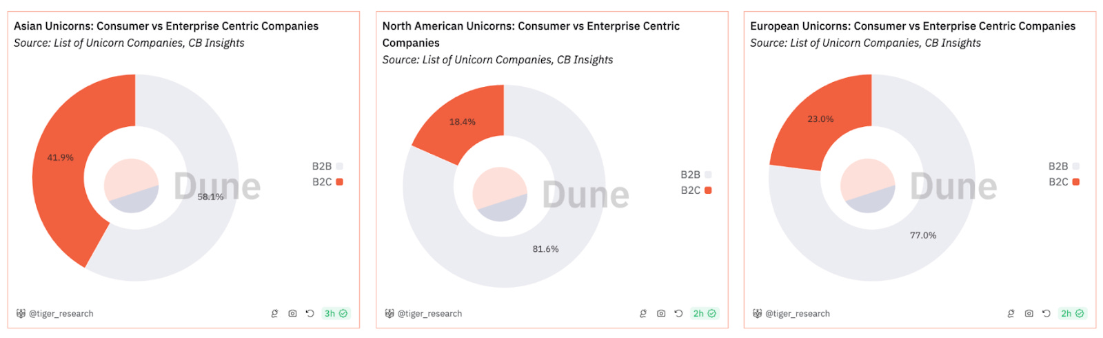 이러한 관점에서 아시아는 두 가지 핵심적인 강점을 가진 지역이다. 첫 번째로 컨슈머 중심의 혁신 역량이다. CB 인사이트의 2024년 10월 기준 유니콘 기업 현황을 살펴보면, 아시아 유니콘 기업은 약 42% 가량이 B2C 기업으로 북미와 유럽을 크게 앞서고 있다. 이는 방대한 디지털 네이티브 소비자층과 발달된 모바일 결제 인프라 등 아시아만의 특성이 영향을 미친 것으로 판단된다. 이러한 컨슈머 중심의 혁신은 웹3 생태계에서도 이어질 것으로 기대되며, 아시아 시장이 새로운 형태의 컨슈머 앱 등장을 주도할 것으로 전망된다.