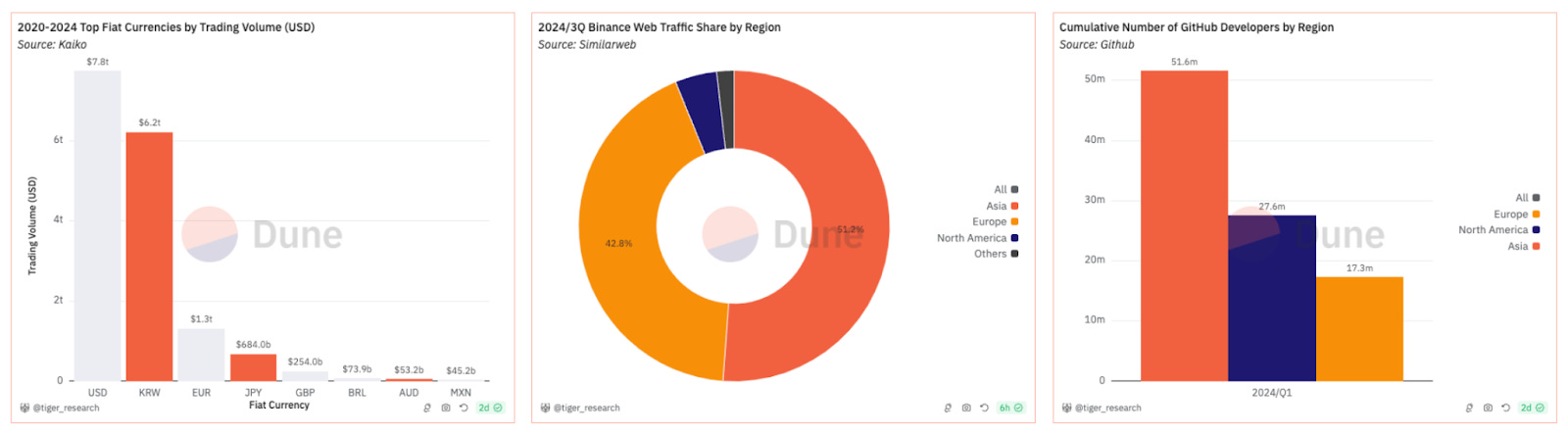 또한 아시아는 웹3 산업에서도 주도적인 위치를 점하고 있는데, 이는 다음 세 가지 핵심 요인에 기인한다. 첫 번째로 아시아는 젊은 디지털 네이티브 인구를 기반으로 강력한 크립토 사용자층을 보유하고 있다. 트리플 에이(Triple-A) 조사에 따르면, 글로벌 가상자산 사용자 5억 2천만 명 중 60%에 달하는 3억 2천만 명이 아시아에 분포된다. 두 번째로 거래 활성화 측면에서도 두각을 나타내는데, 한국의 경우 2024년 1분기 원화 기반 거래량이 미국 달러 기반 거래량을 앞지를 정도이며, 글로벌 거래소 바이낸스의 최근 3개월 웹 트래픽 중 50% 이상이 아시아에서 발생한 바 있다. 마지막으로 기술 인재 풀에서도 우수한데, 깃헙(Github) 통계 기준 5천만 명의 개발자를 보유하고 있으며, 특히 웹3 게임 개발 분야에서는 전체 개발자의 40%를 차지할 정도로 주도적인 역할을 하고 있다.